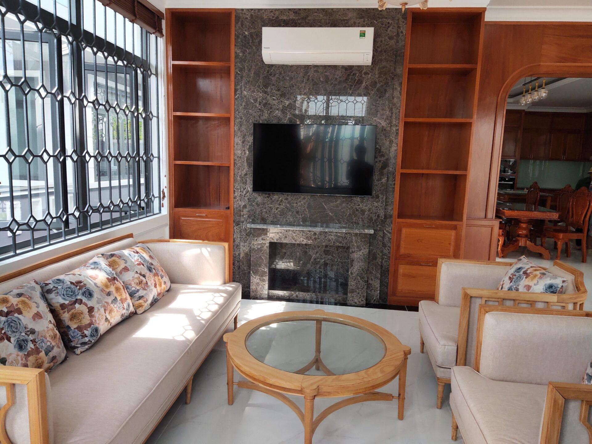 Cập nhật nhanh chóng về xu hướng nội thất hiện đại, với góc nhìn hoàn toàn mới, các kiến truc sư công ty TNHH thiết kế xây dựng Thảo Nguyên mang đến cho gia chủ những cảm hứng để lựa chọn cho gia đình một bộ bàn ghế sofa bọc nỉ xám trang nhã phối xung quang màu nâu đỏ của gỗ đỏ cao cấp từ thiên nhiên, đây cũng là điểm nhấn căn phòng của gia chủ tuyệt vời và tiện nghi, tiết kiệm không gian sống.