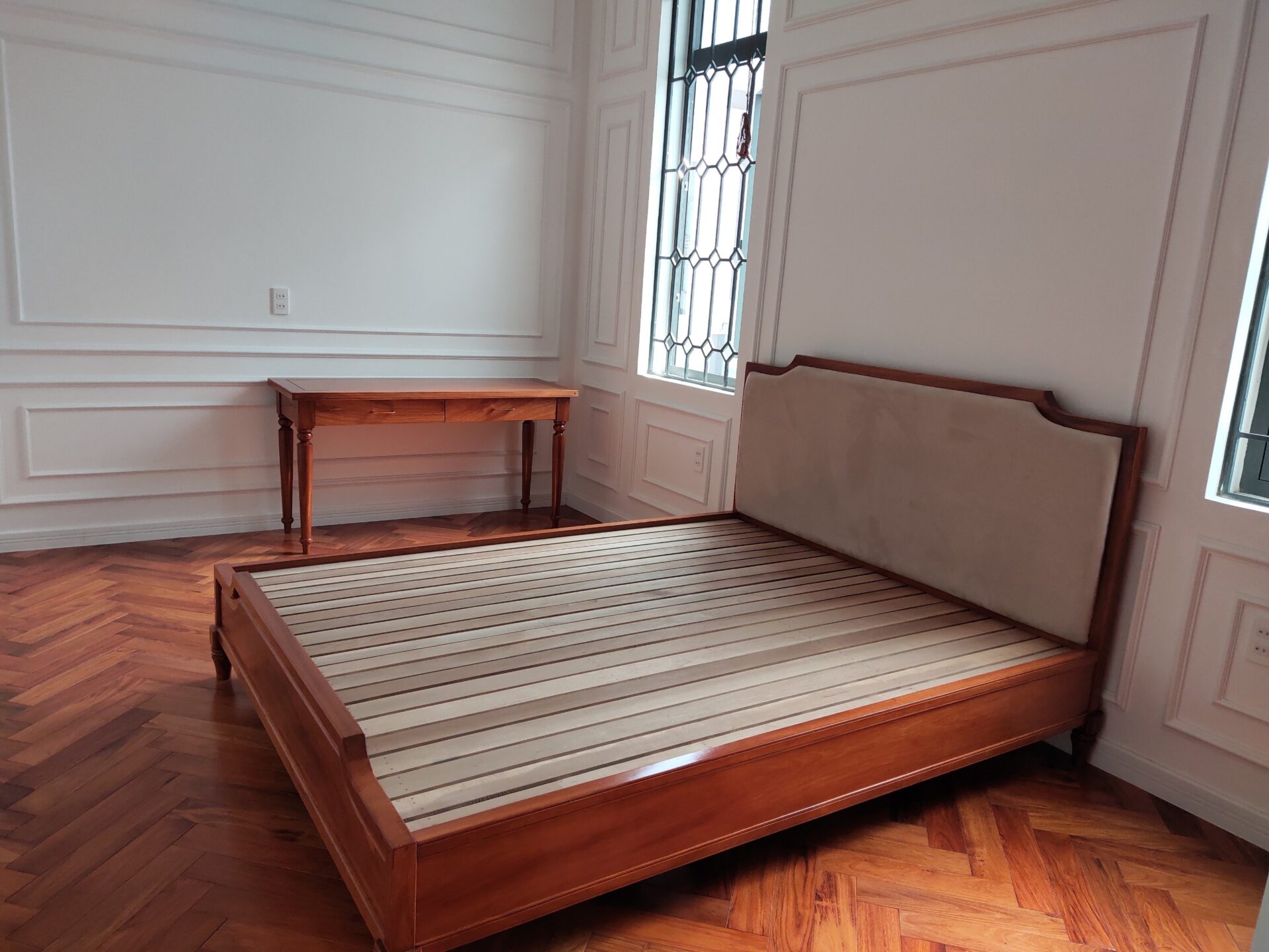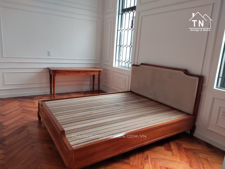 Các kiến trúc sư công ty chúng tôi đã tinh tế sử dụng chất liệu gỗ đỏ cao cấp trang trí nội thất cho căn biệt thự sàn gỗ, tủ quần áo, kệ tivi, cửa bằng khung sắt họa tiết hoa văn được sơn tĩnh điện màu xám, đã tạo nên vẻ đẹp sang trọng, độc đáo trong phong cách hiện đại tại phòng ngủ mặc dù với phong cách này đồ nội thất bằng gỗ đỏ cao cấp đựa nhiều gia chủ ưa chuộng hiện nay.