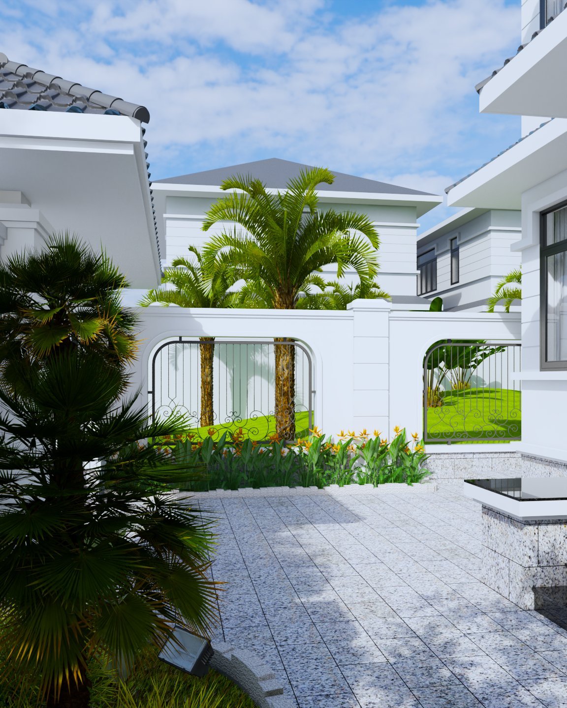 Căn biệt thự được sử dụng 2 tone màu chủ đạo gồm: trắng và ghi. Qua đó tổng thể ngôi nhà mang vẻ đẹp hài hòa, đơn giản nhưng không kém phần sang trọng.  Không gian biệt thự kết hợp cùng màu xanh của cây cối quanh nhà tạo nên sự hoà hợp, tôn lên từng đường nét của ngôi nhà. Sở dĩ mẫu biệt thự cao cấp này được đánh giá cao là do có sự pha trộn với kiến trúc Nhật Bản bởi những đường nét tinh tế và sự tinh tế trong từng kết cấu. Hệ thống tường bao quanh vừa đem lại cảm giác an toàn vừa trang hoàng cho ngôi nhà trở nên tráng lệ. Việc kết hợp trồng hoa ở phía ngoài tường bao vừa giúp ngôi nhà trở nên nổi bật vừa tạo ra một địa điểm chụp ảnh tuyệt vời.