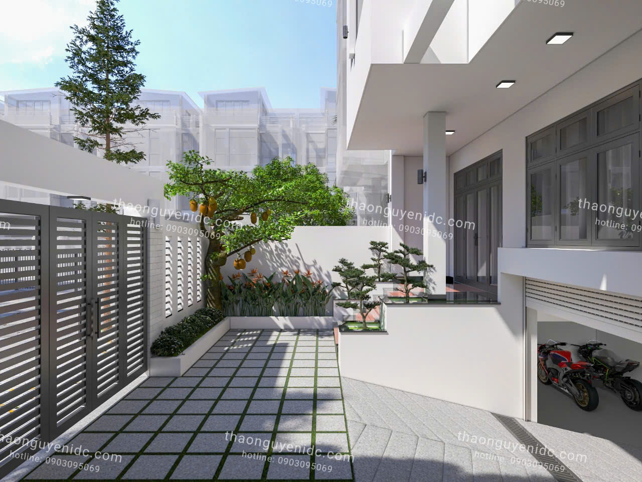 Với tư duy thiết kế toàn diện, Thảo Nguyên IDC không chỉ chú trọng hình khối kiến trúc mà còn tỉ mỉ trong từng chi tiết kỹ thuật.Hệ thống đèn âm trần, đèn hắt tường và đèn lối đi được bố trí khéo léo, sử dụng ánh sáng trắng trung tính – giữ cho không gian luôn sang trọng, hiện đại cả ban ngày lẫn ban đêm.Rãnh thoát nước âm chạy dọc theo độ dốc sân, vừa đảm bảo thoát nước hiệu quả, vừa không làm ảnh hưởng đến thẩm mỹ chung.Cửa gara là loại cửa cuốn tự động, vận hành êm và an toàn. Một hồ nước nhỏ đặt cạnh bậc thềm được trồng cây phong thủy – tạo điểm nhấn xanh mát và hài hòa ngũ hành.