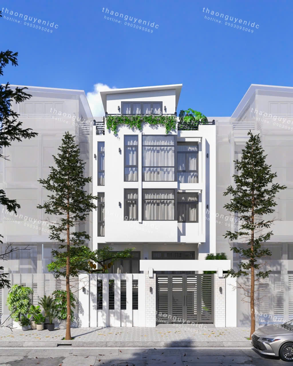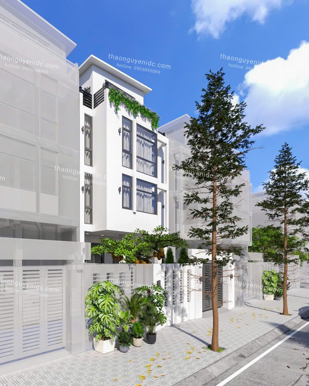 Tông trắng chủ đạo giúp toàn bộ mặt tiền trở nên sáng bừng và nổi bật giữa dãy nhà liền kề, đồng thời làm nền hoàn hảo để tôn lên các chi tiết như hệ lam đứng màu tối, cửa nhôm kính xám đen và ban công phủ đầy dây leo xanh mát. Hệ cửa được bố trí đều theo phương dọc giúp tận dụng tối đa ánh sáng tự nhiên, đồng thời tạo nhịp điệu thị giác hài hòa cho tổng thể.