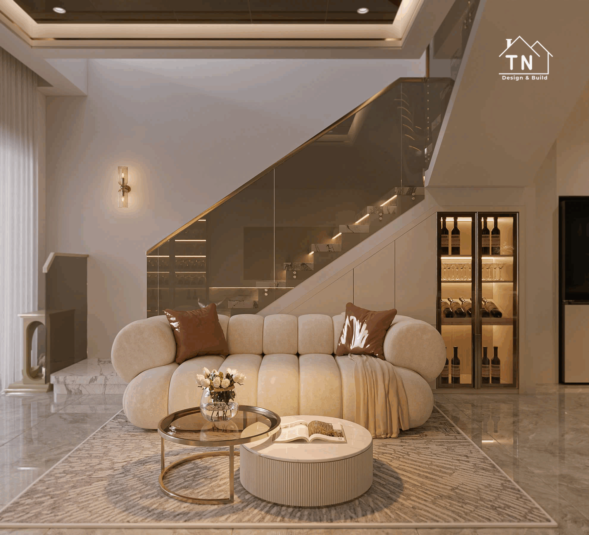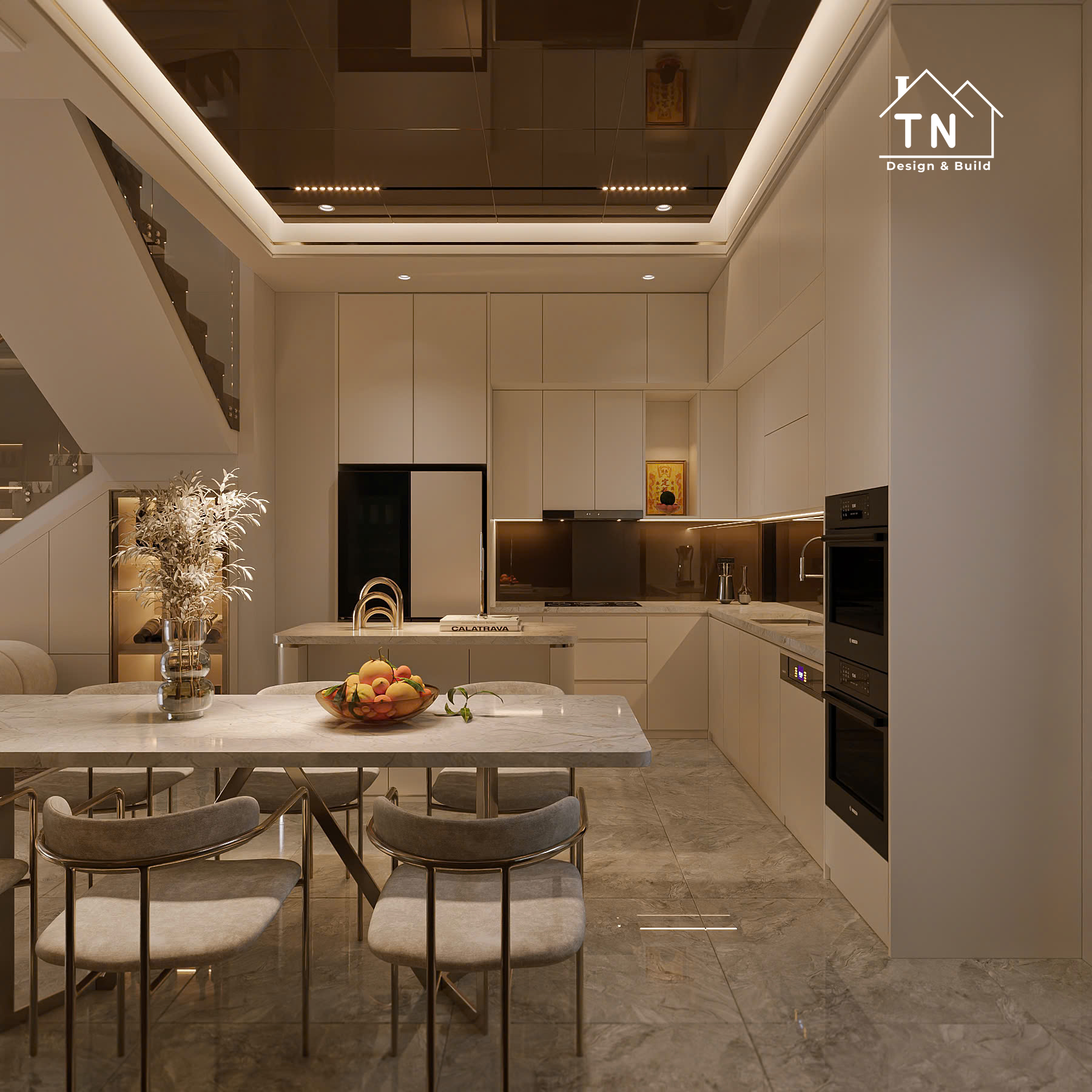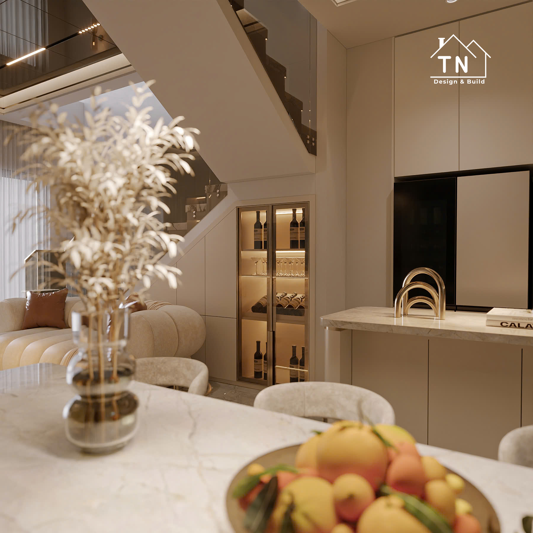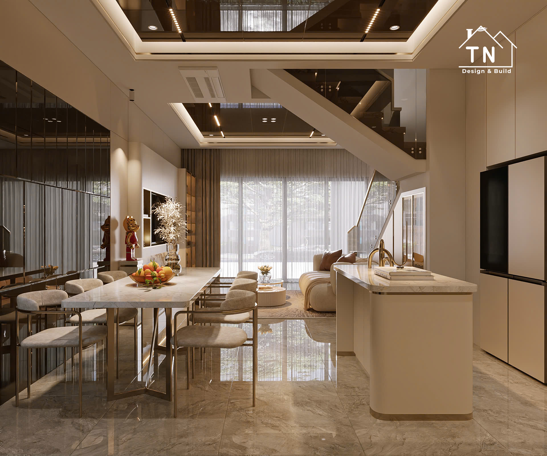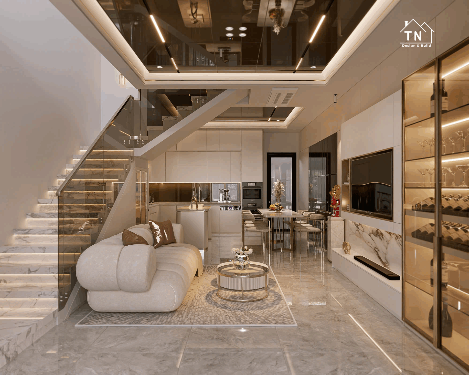 Công trình kiến tạo theo tinh thần Modern Luxury, nơi sự sang trọng không phô trương mà thể hiện qua cách tổ chức không gian chặt chẽ, vật liệu được chọn lọc tinh tế và ánh sáng được xử lý khéo léo. Tổng thể công trình mang cảm giác thoáng đãng, liền mạch, với những mảng gỗ ấm, đá tự nhiên và bề mặt hoàn thiện cao cấp đan xen hài hòa, tạo nên một không gian sống vừa hiện đại vừa giàu chiều sâu cảm xúc.