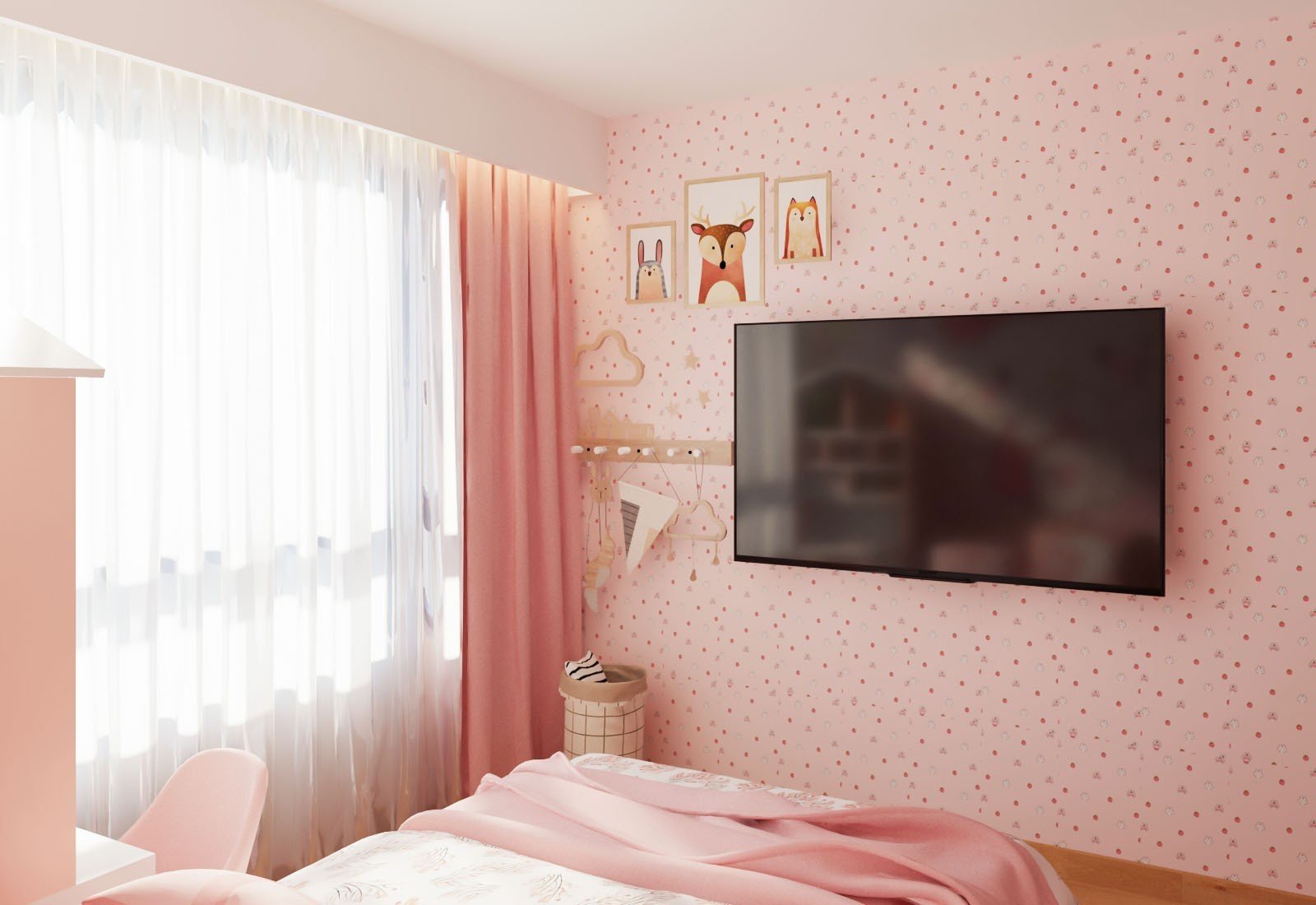 Với thiết kế nội thất phòng ngủ cho bé gái con Chị Hoa được các kiến trúc sư lựa chọn gam màu hồng làm chủ đạo, bố trí bàn học, tủ kệ ốp tường tiết kiệm diện tích căn phòng, cánh cửa sổ được đặt nơi hướng ra ngoài đón ánh sáng trực tiếp vào trong căn phòng mang đến cảm giác thoáng mát và dễ chịu nhất, bàn học tập được bố trí cạnh giường ngủ với giá sách đáng yêu tạo nên không gian ấm ấp thoải mái khi bé tập trung vào việc học.