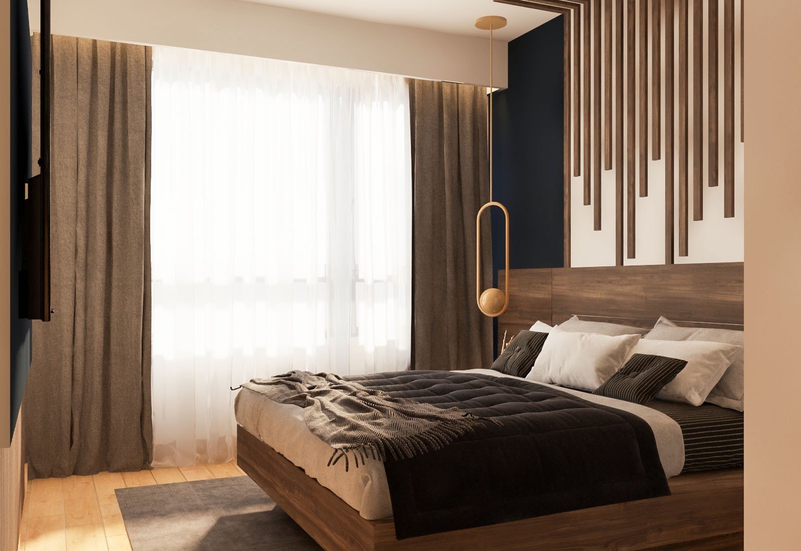 Thiết kế nội thất  phòng ngủ được các kiến trúc sư sử dụng màu trắng phối màu nâu gỗ vân cao cấp tạo nên không gian sang trọng. Bàn trang điểm được thiết kế tinh tế, tấm kính trong làm nổi bật phản chiếc ánh đèn ấm áp càng tăng thêm sự sang trọng. Giường ngủ bằng chất liệu gỗ cao cấp, tường được trang trí màu trắng và các thanh gỗ tinh tế. Hưởng lợi từ ánh sáng qua lớp rèm, không gian trở nên rộng rãi, dễ chịu sau ngày làm mệt mỏi.