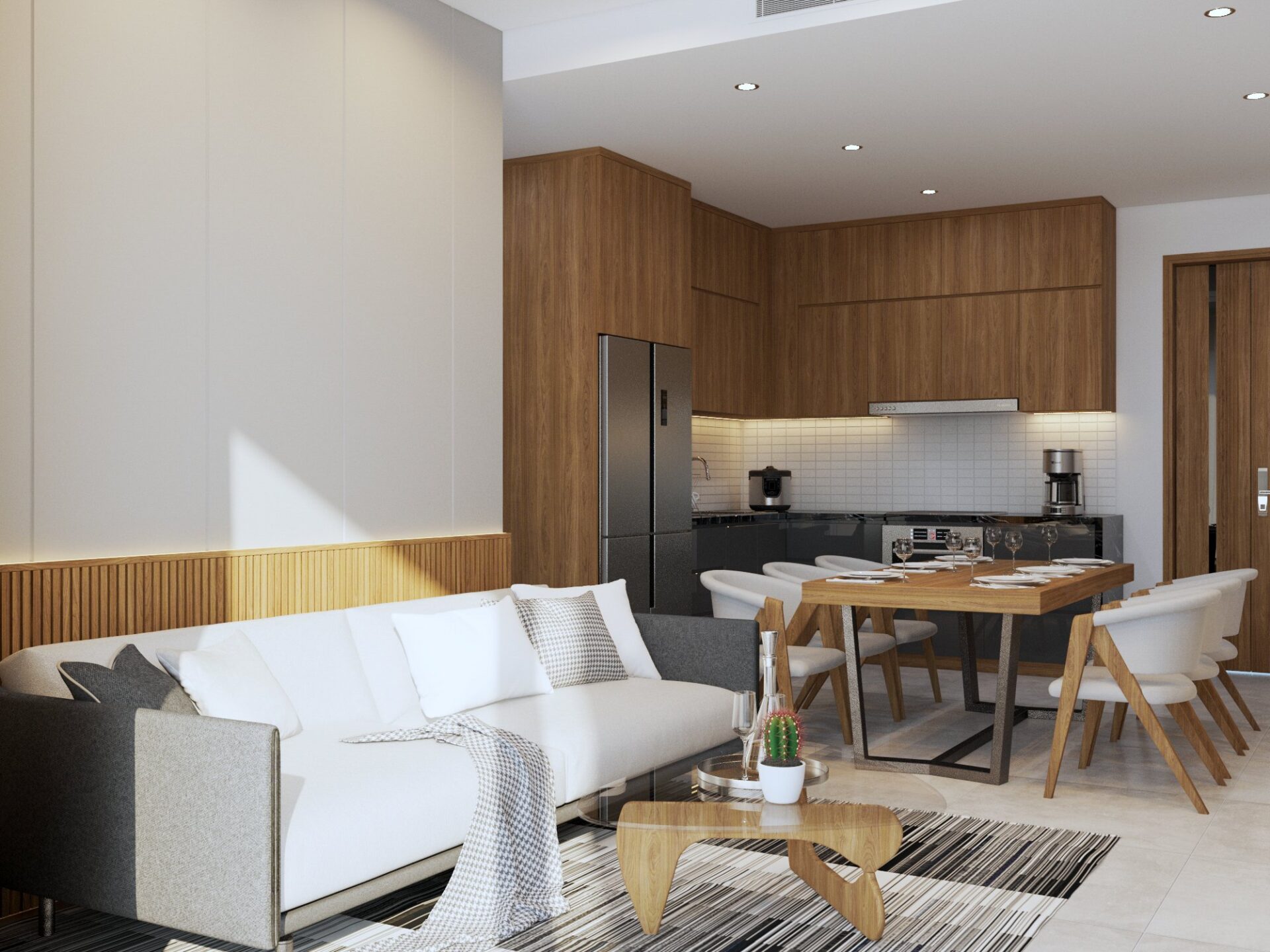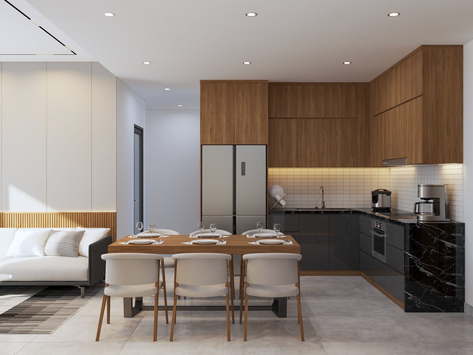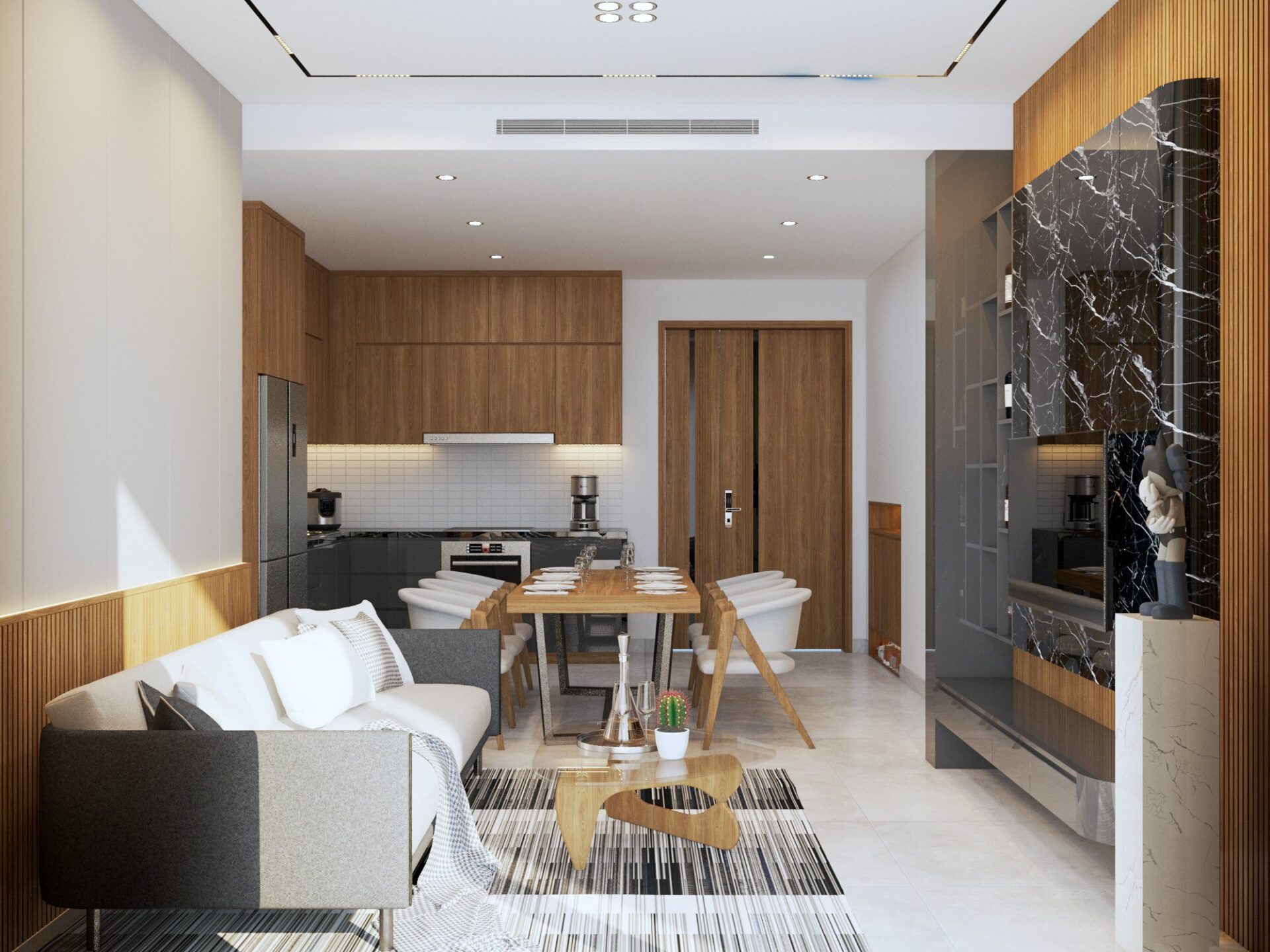 Để tối ưu không gian phòng khách, cũng như nhiều chung cư khác, các kiến trúc sư công ty TNHH thiết kế xây dựng Thảo Nguyên lựa chọn thiết kế phòng khách liền bếp nhằm tiết kiệm thời gian tối đa. Bàn ăn được thiết kế cho 4 người sử dụng loại dành cho 4 người là tối thiểu, giúp giảm thiểu tối đa diện tích chiếm mặt bằng của vật dụng. Tô điểm thêm những chậu hoa mini, cây cảnh và bình bông giúp cân chỉnh không gian trở nên gần gũi với thiên nhiên.