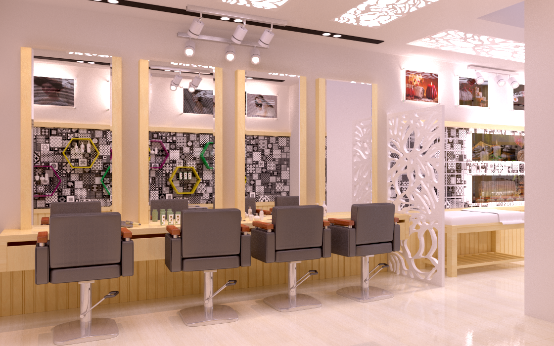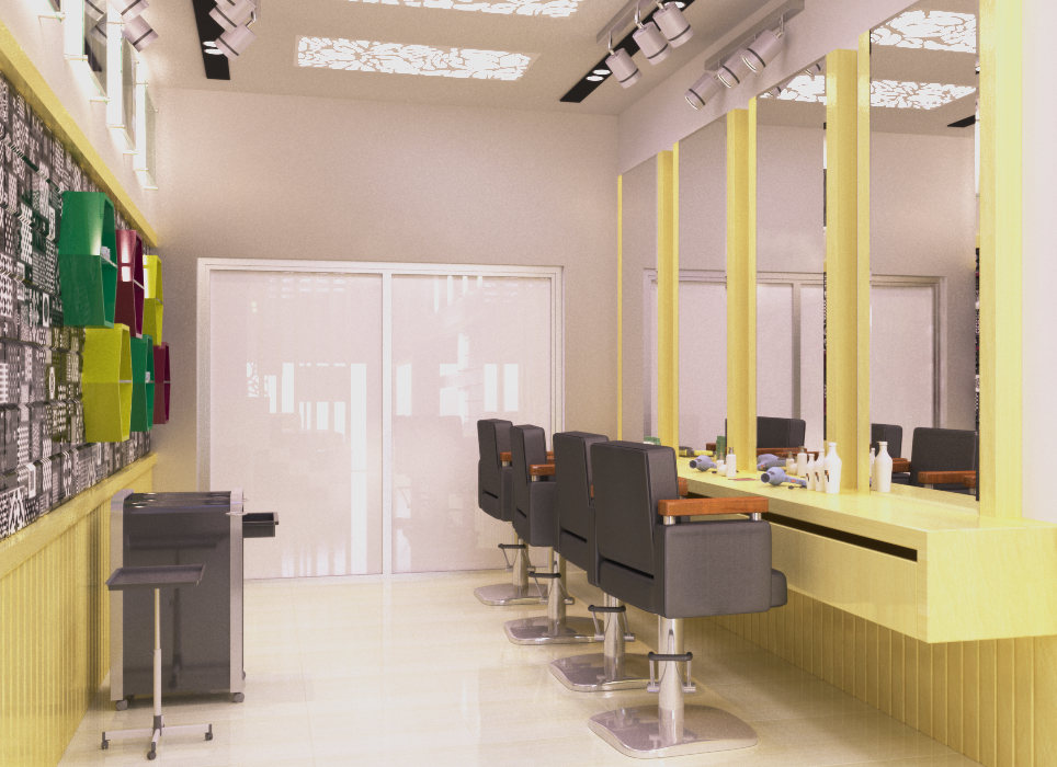 Đối với khu vực salon tóc các kiến trúc sư công ty TNHH thiết kế xây dựng Thảo Nguyên đã sử dụng tone màu trắng làm chủ đạo phối màu vàng nhạt của gỗ, kết hợp cùng ánh sáng tập trung vào phần gương theo phong cách đặc trưng của salon cao cấp. Phần gương hình chữ nhật có viền khung gỗ nổi đi ánh sáng vàng xung quanh.
