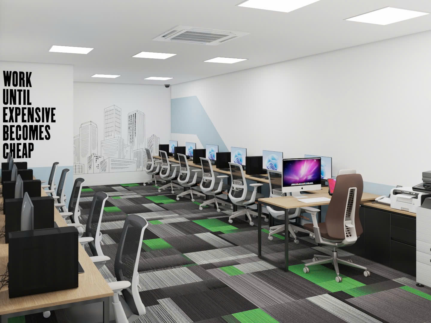 Khu vực làm việc chung được thiết kế theo phong cách hiện đại, tận dụng tối đa không gian mở nhằm tạo sự kết nối giữa các nhân viên. Nội thất được lựa chọn kỹ lưỡng với các món đồ như bàn làm việc dài, ghế xoay thoải mái và hệ thống lưu trữ thông tin, đảm bảo sự tiện dụng mà vẫn duy trì tính thẩm mỹ. Màu sắc trang nhã như trắng, xám, đen tạo nên không gian dễ chịu, giảm stress và thúc đẩy tinh thần sáng tạo.