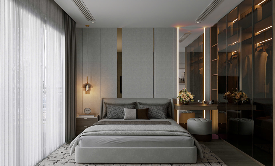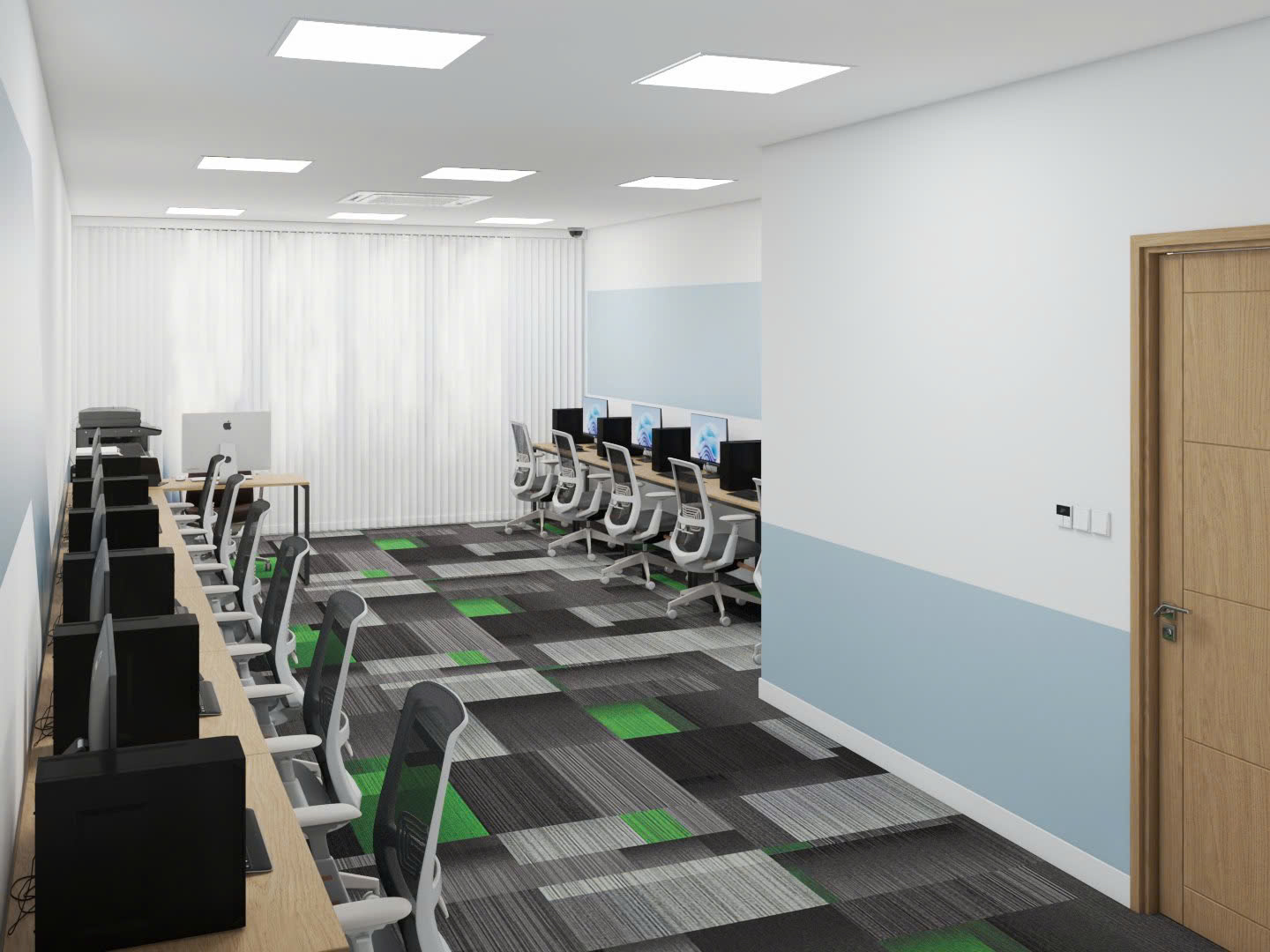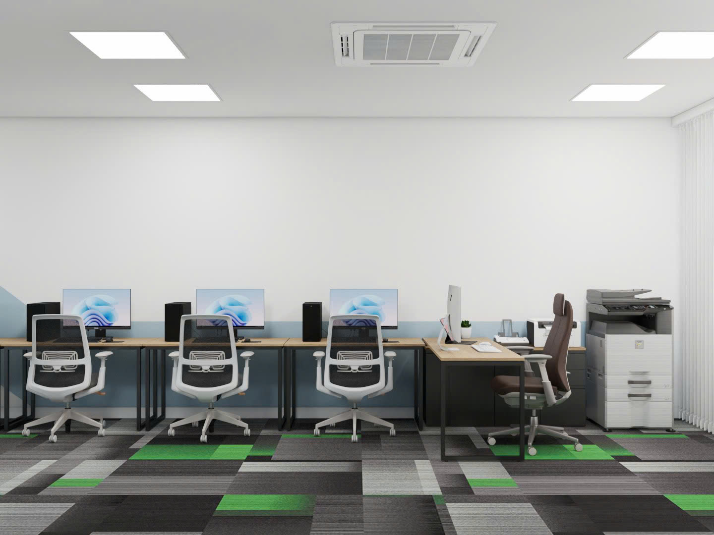 Thiết kế đèn trần âm tường không chỉ giúp tiết kiệm diện tích mà còn tạo ánh sáng đồng đều, không gây chói mắt, giúp bảo vệ thị lực và tạo cảm giác dễ chịu cho nhân viên. Điều hoà âm tường cũng là một lựa chọn thông minh trong không gian văn phòng hiện đại. Thiết kế này giúp không gian trông gọn gàng hơn và tăng cường hiệu quả làm mát mà không gây ồn ào. Quan trọng hơn là thiết kế âm tường hạn chế bám bụi và dễ dàng bảo trì.