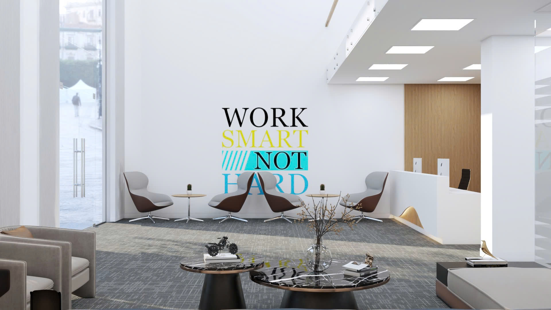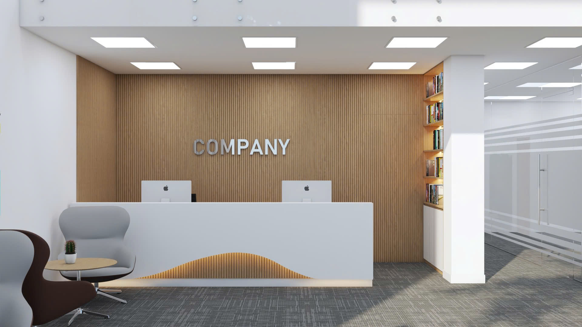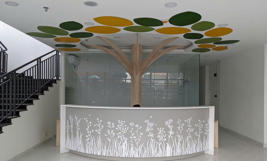 Khu vực lễ tân được coi là bộ mặt của doanh nghiệp, vì vậy thiết kế ở đây cần được đầu tư tỉ mỉ. Bàn lễ tân được thiết kế theo phong cách tối giản nhưng sang trọng, sử dụng chất liệu gỗ tự nhiên và kính cường lực để tạo nên vẻ thanh lịch và hiện đại.
