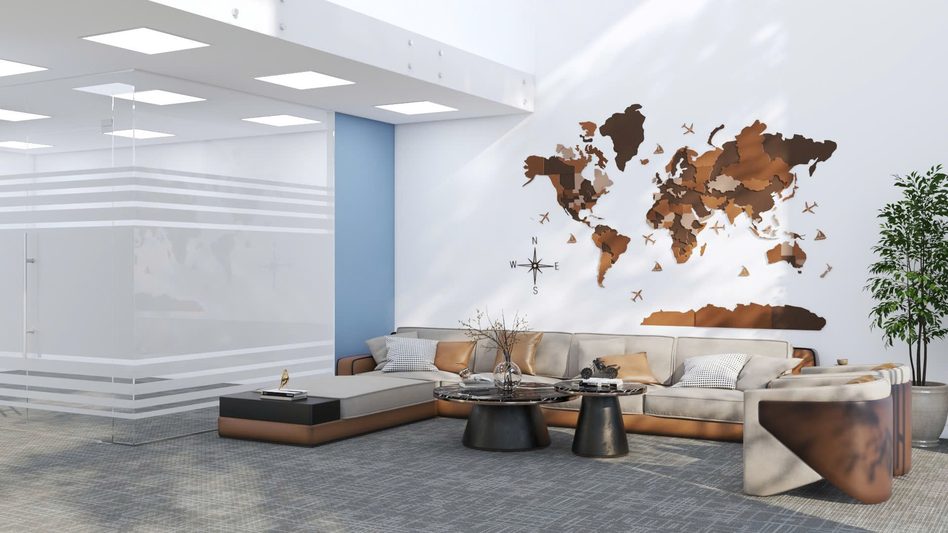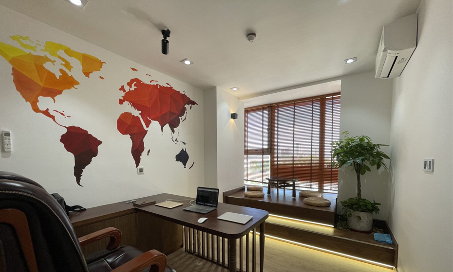 Với diện tích mặt bằng 860m2, việc sắp xếp không gian sao cho khoa học, hài hoà mà vẫn  giữ sự kết nối liền mạch giữa các khu vực luôn là thách thức lớn. Tại công trình này, thiết kế Thảo Nguyên không chỉ tập trung vào việc tối ưu hoá từng mét vuông mà còn khéo léo kết hợp phong thuỷ để đảm bảo mỗi phòng đều có vị trí đắc địa, mang lại sự thịnh vượng và năng lượng tích cực cho doanh nghiệp. Mỗi không gian được thiết kế mang lại dấu ấn riêng, tinh tế và độc đáo nhưng vẫn giữ được sự thống nhất hoàn hảo trong tổng thể nội thất, tạo nên một trải nghiệm hoàn mỹ cho toàn bộ văn phòng.