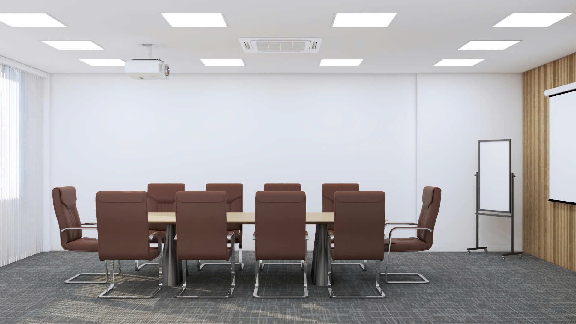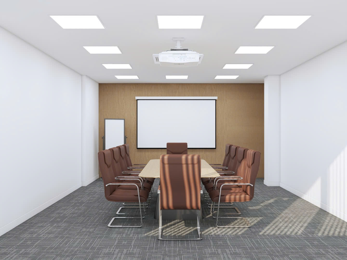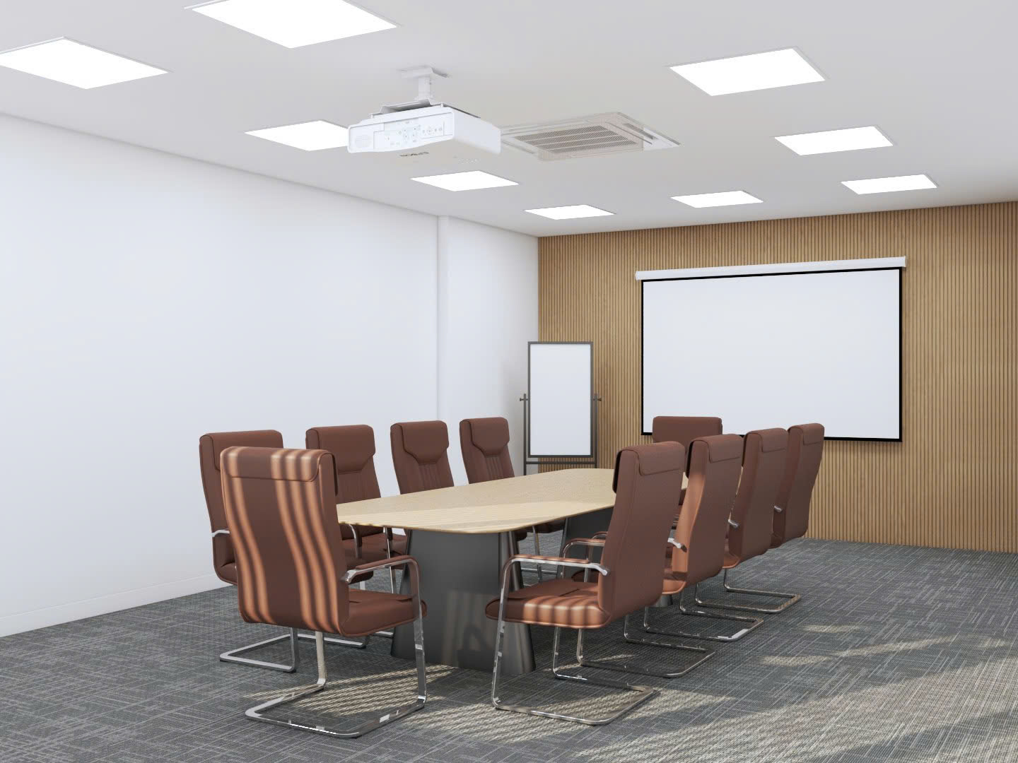 Bố trí ghế ngồi thoải mái và bàn họp lớn giúp tất cả các thành viên dễ dàng tương tác trong các buổi họp hoặc hội nghị. Ánh sáng từ hệ thống đèn trần kết hợp với ánh sáng tự nhiên mang lại không gian tươi sáng, tạo cảm giác thoải mái và năng động.