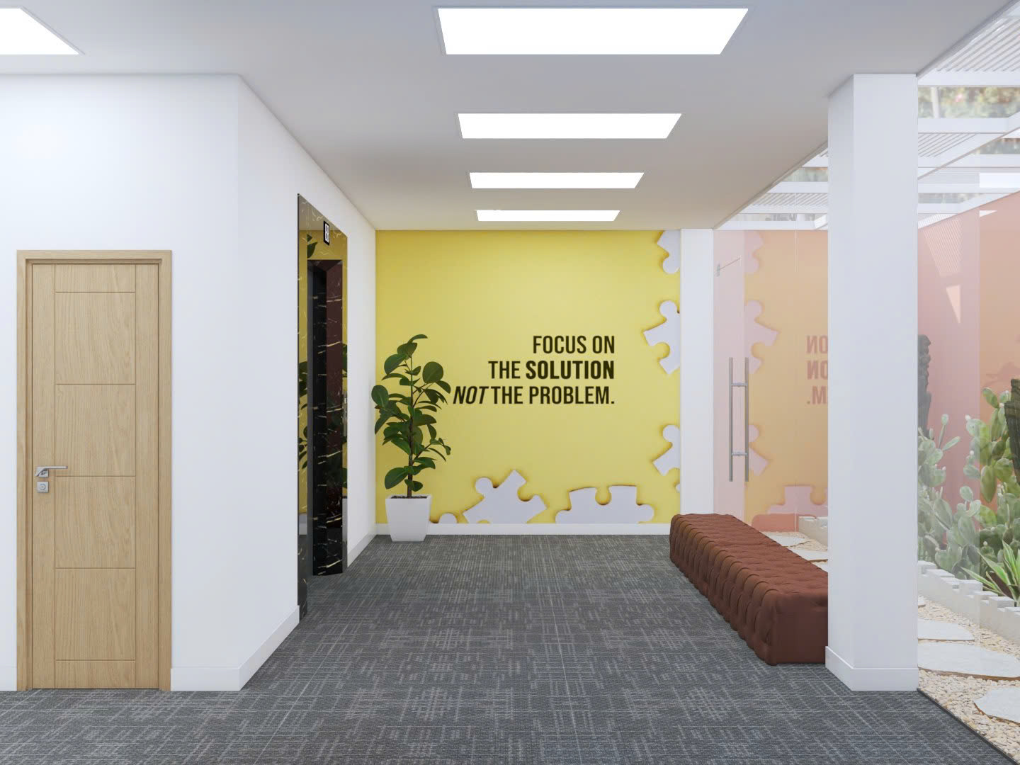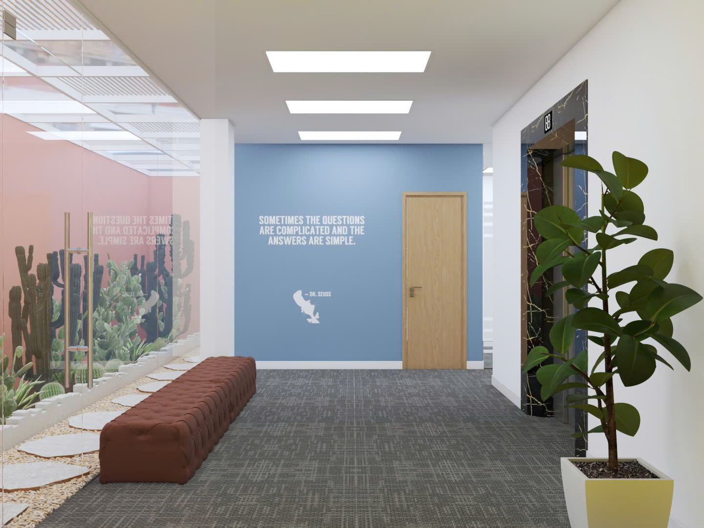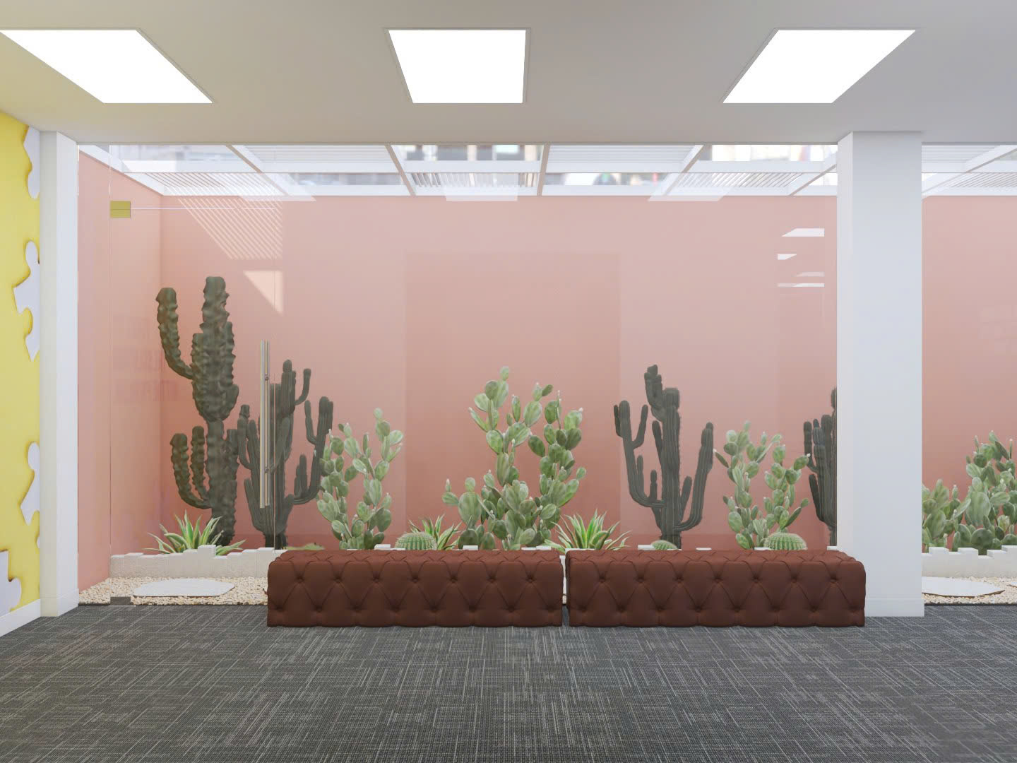 Bên cạnh những thiết kế cơ bản của văn phòng, điểm ấn tượng của văn phòng Lakeview là khu vực cây xanh bên trong. Qua đó tạo nên không gian tươi mát và gần gũi với thiên nhiên. Cây xương rồng và cây ảnh được bố trí tinh tế dọc theo tường kính kết hợp cùng tông màu hồng pastel, mang lại cảm giác thư giãn và thẩm mỹ. Không gian này không chỉ cải thiện không khí mà còn giúp nhân viên giảm căng thẳng, tăng năng suất làm việc và khơi gợi sự sáng tạo.