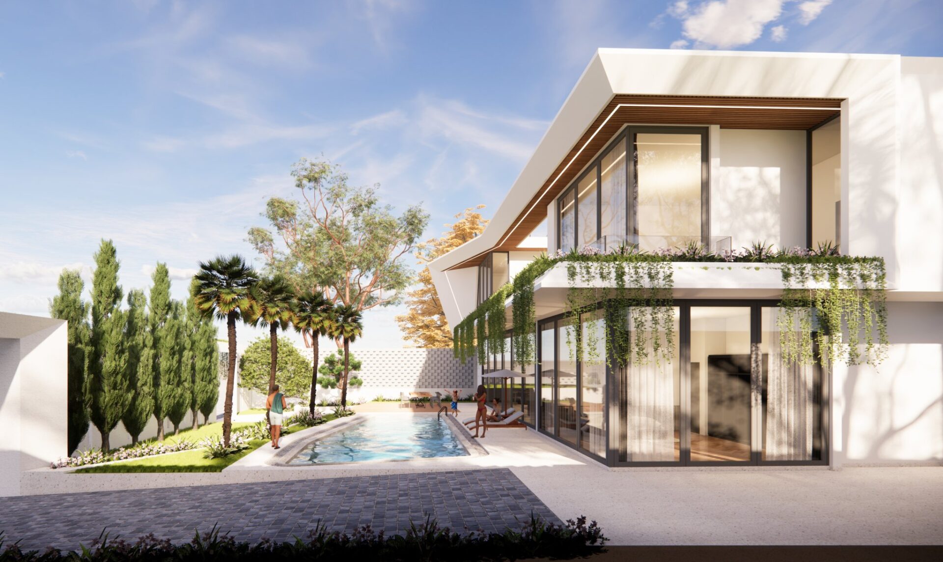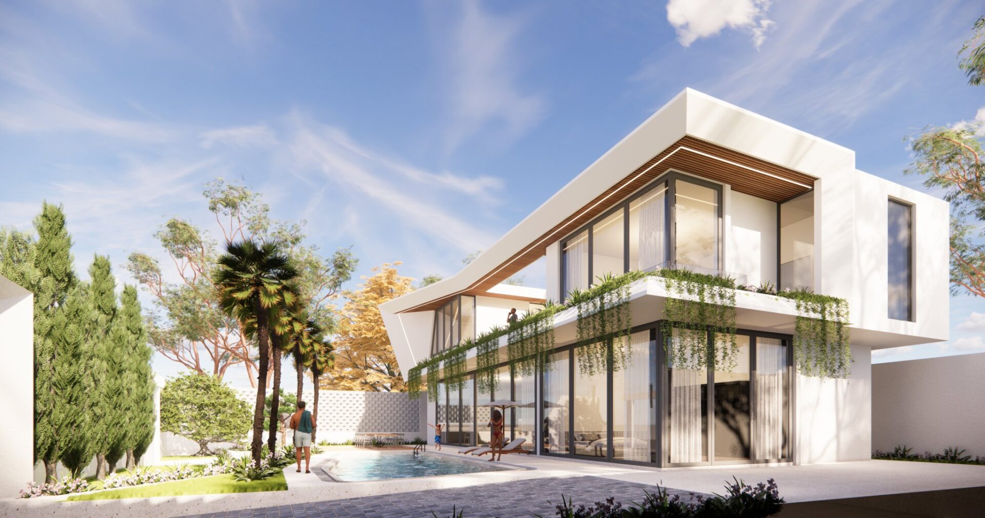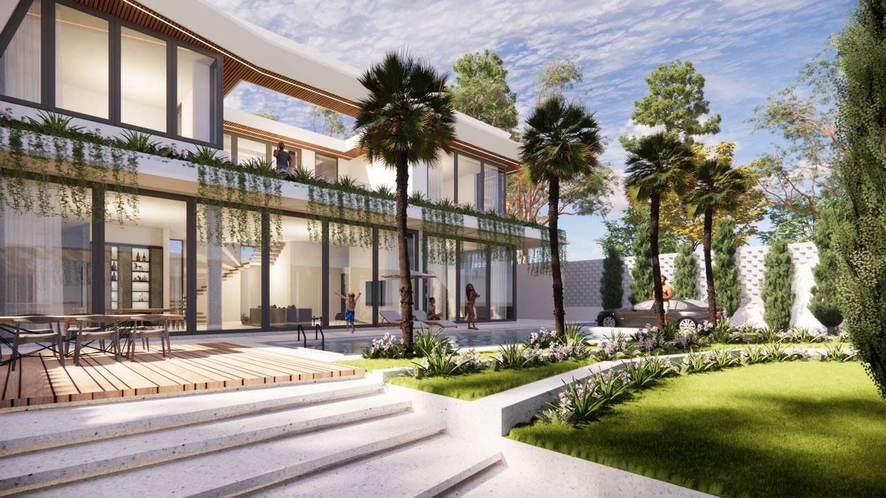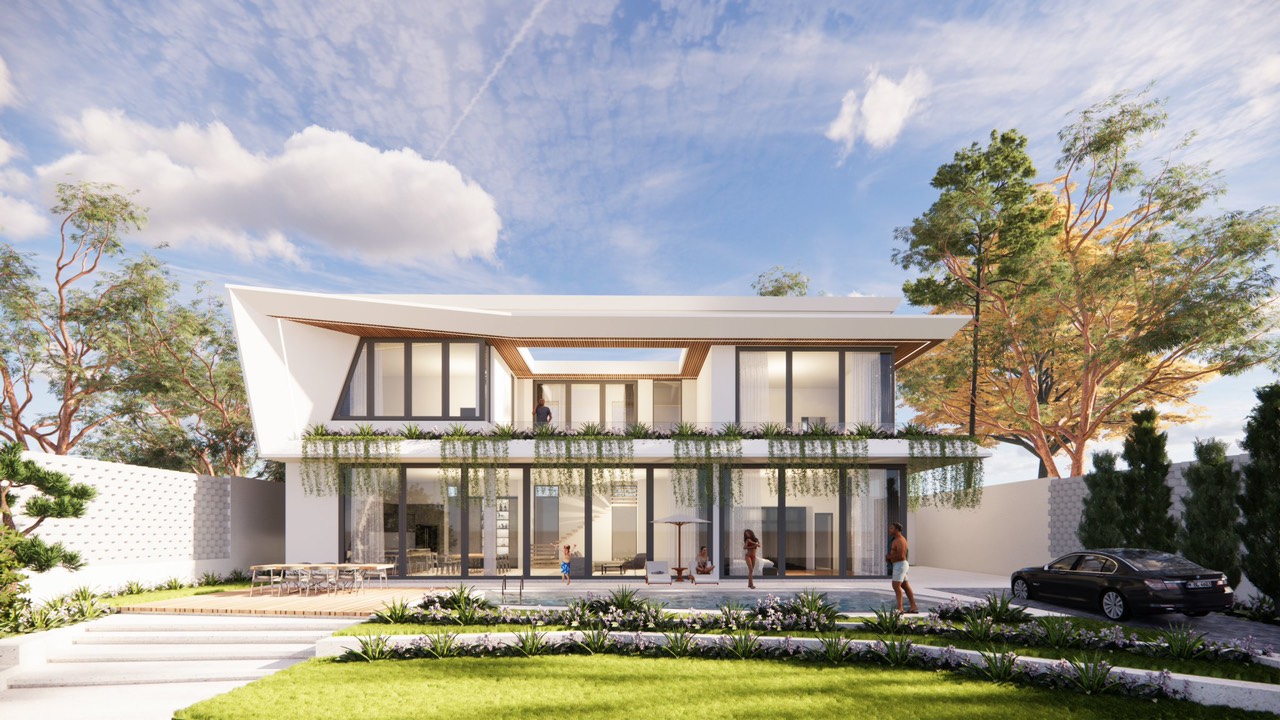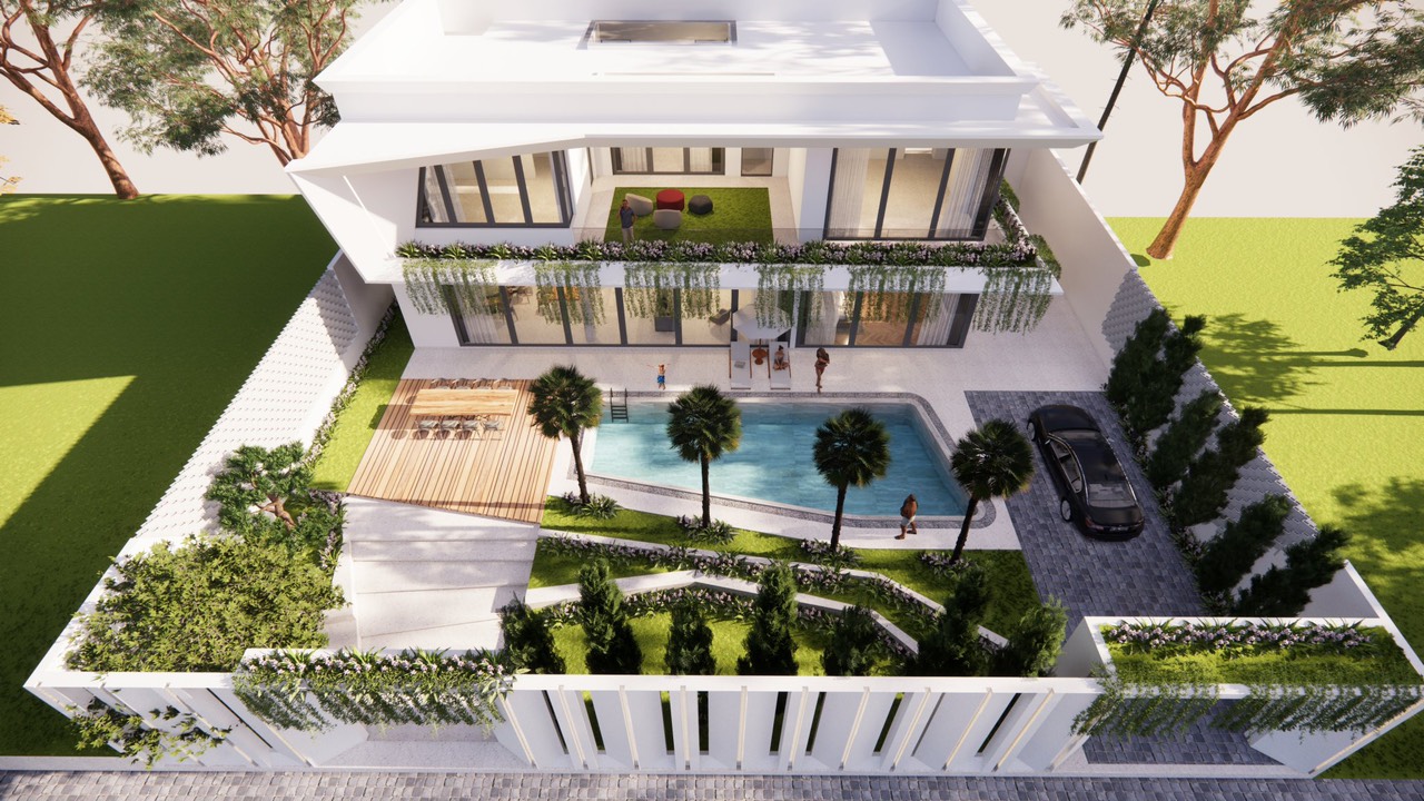 Thiết kế tổng thể mang đậm hướng hiện đại, phóng khoáng với những đường nét rõ ràng, vuông vứt cho phần khung villa. Đặc biệt, bao phủ phía trên là thiết kế mái đúc bê tông vuông vứt theo phong cách hiện đại. Nét vuông vứt này không chỉ mang đến không gian mát mẻ cho khuôn viên villa mà còn giúp cảnh quan cây xanh, bể bơi, hài hòa hơn từ màu sắc đến đường nét, để căn villa của gia chủ là tuyệt phẩm của thiên nhiên.