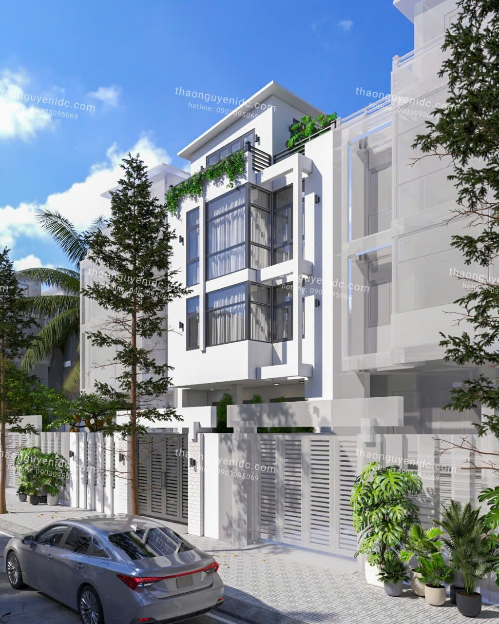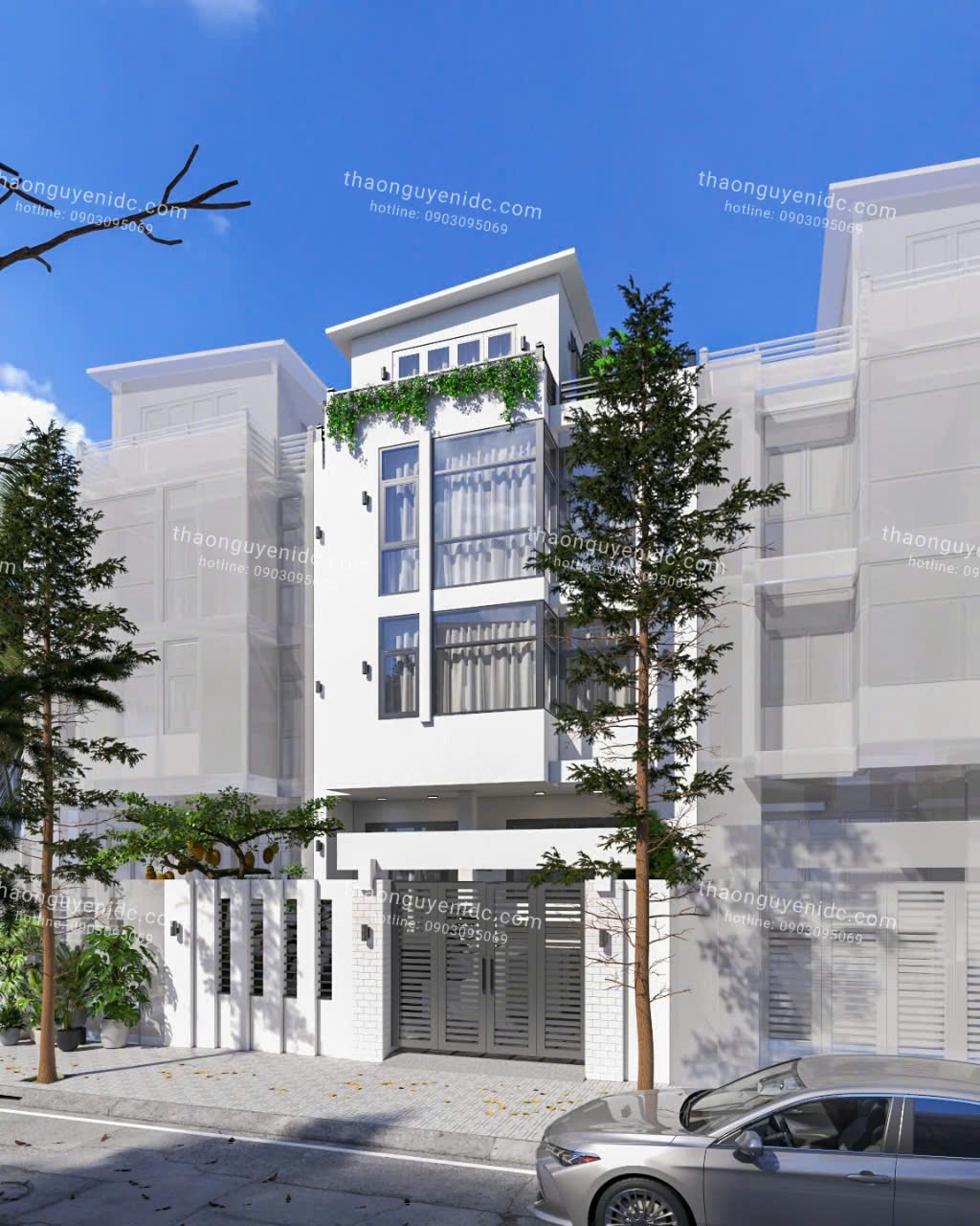 Tông trắng chủ đạo giúp toàn bộ mặt tiền trở nên sáng bừng và nổi bật giữa dãy nhà liền kề, đồng thời làm nền hoàn hảo để tôn lên các chi tiết như hệ lam đứng màu tối, cửa nhôm kính xám đen và ban công phủ đầy dây leo xanh mát. Hệ cửa được bố trí đều theo phương dọc giúp tận dụng tối đa ánh sáng tự nhiên, đồng thời tạo nhịp điệu thị giác hài hòa cho tổng thể.