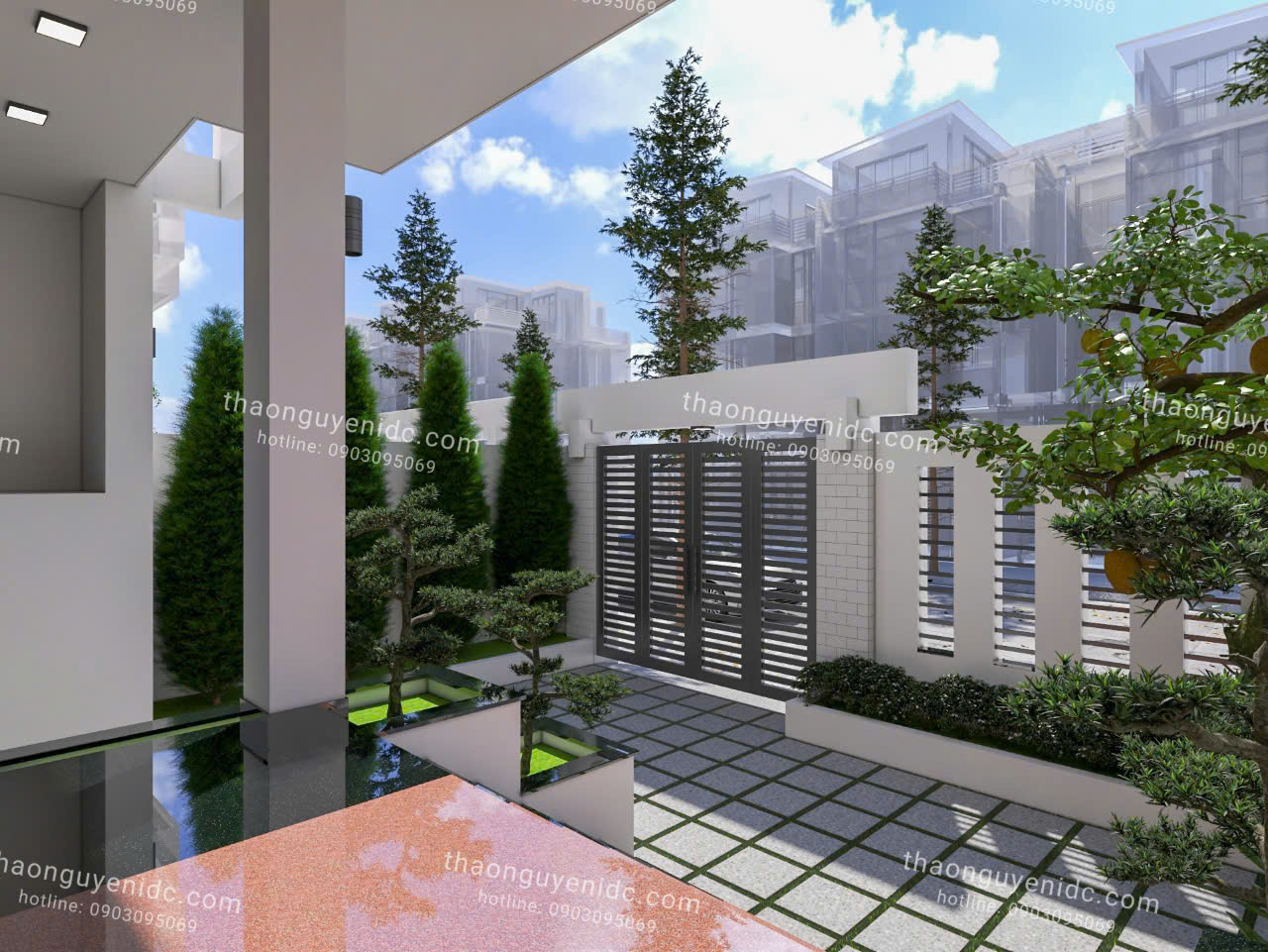 Với tư duy thiết kế toàn diện, Thảo Nguyên IDC không chỉ chú trọng hình khối kiến trúc mà còn tỉ mỉ trong từng chi tiết kỹ thuật.Hệ thống đèn âm trần, đèn hắt tường và đèn lối đi được bố trí khéo léo, sử dụng ánh sáng trắng trung tính – giữ cho không gian luôn sang trọng, hiện đại cả ban ngày lẫn ban đêm.Rãnh thoát nước âm chạy dọc theo độ dốc sân, vừa đảm bảo thoát nước hiệu quả, vừa không làm ảnh hưởng đến thẩm mỹ chung.Cửa gara là loại cửa cuốn tự động, vận hành êm và an toàn. Một hồ nước nhỏ đặt cạnh bậc thềm được trồng cây phong thủy – tạo điểm nhấn xanh mát và hài hòa ngũ hành.