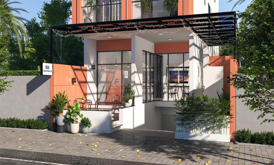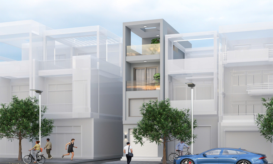 1. Tầng trệt: một phòng khách, phòng ăn + bếp, một ngủ nhỏ.