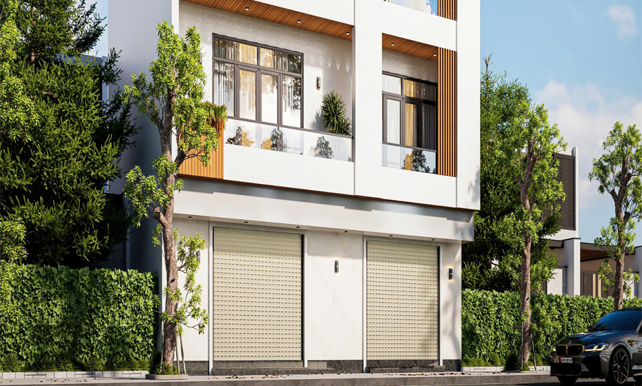 Điểm nhấn đặc biệt của căn biệt thự 1 trệt, 1 lầu sân thượng của công ty TNHH thiết kế xây dựng Thảo Nuyên chính là khoảng không gian cây xanh tại ban công trước nhà, vừa kết nối nội ngoại thất với nhau, vừa tô điểm thêm sự gần gũi của cảnh quan thiên nhiên và gia tăng thêm giá trị thẩm mỹ cho kiến trúc mặt tiền. Thiết kế lam gỗ che nắng được ứng dụng,  đá tự nhiên ốp tường xung quanh bờ rào và tầng 1, tạo nên một công trình vô cùng hiện đại và sang trọng.