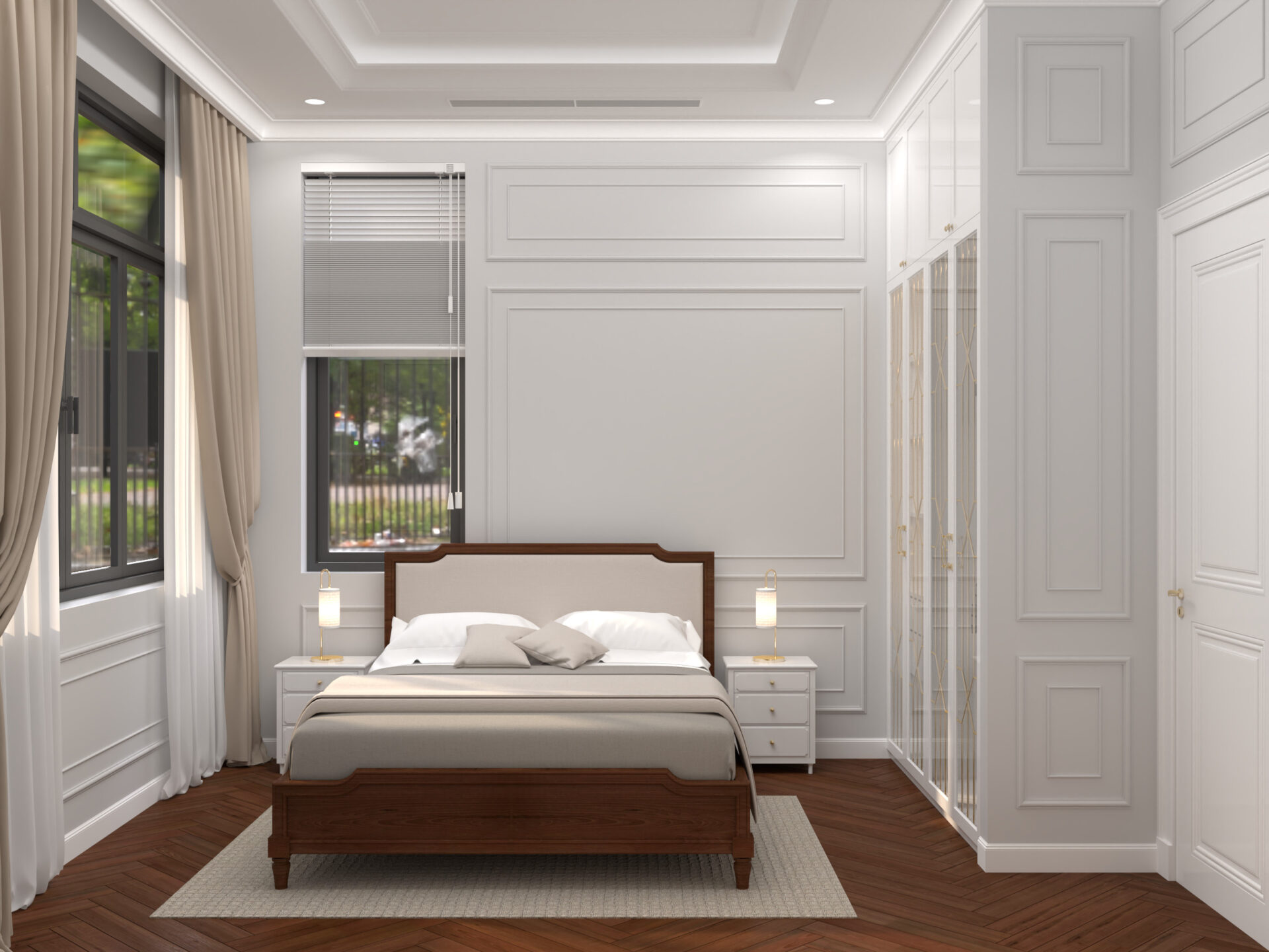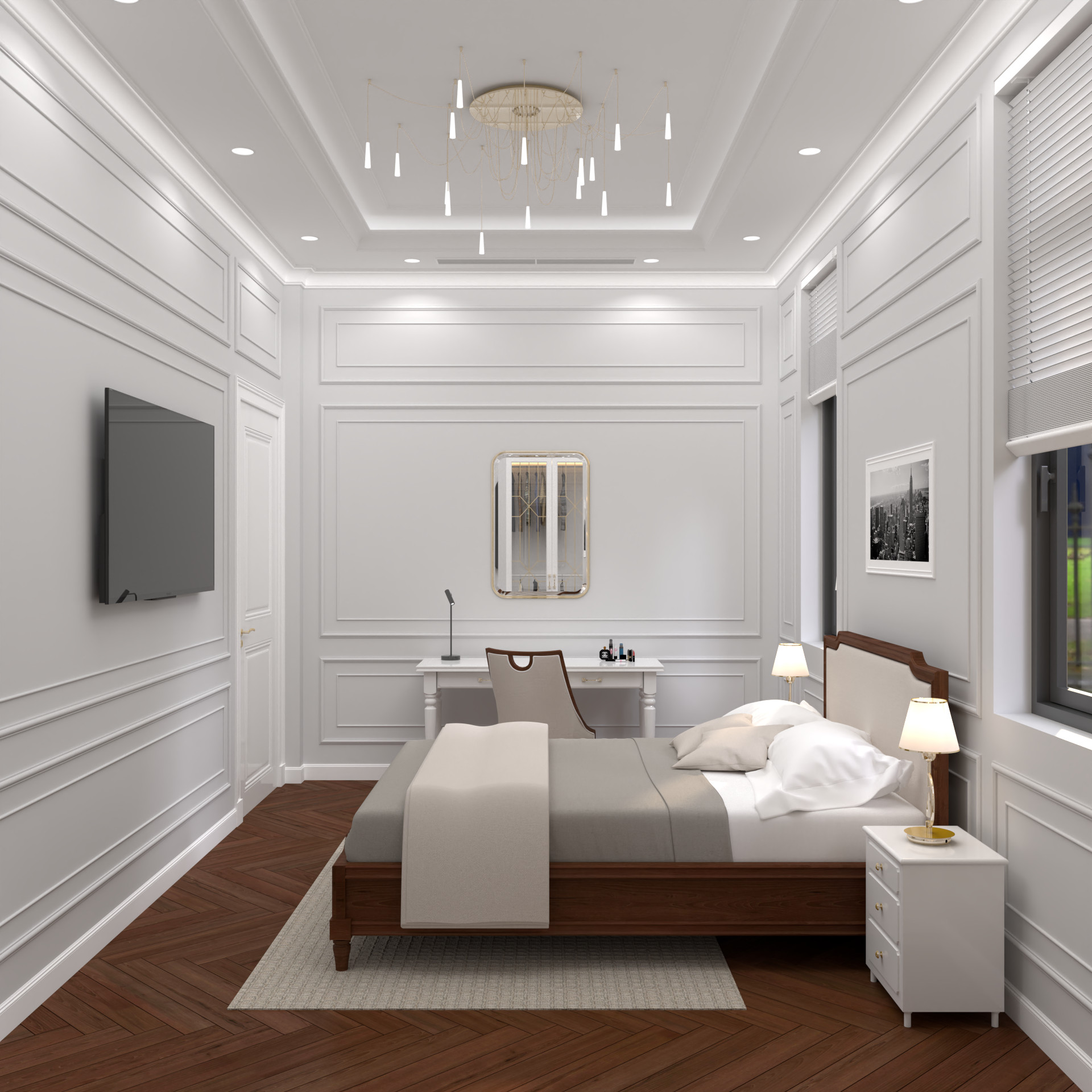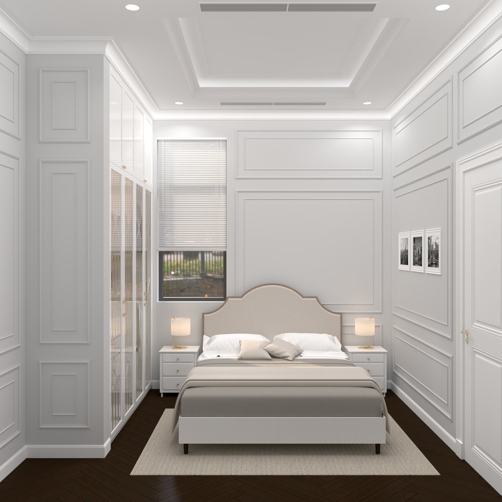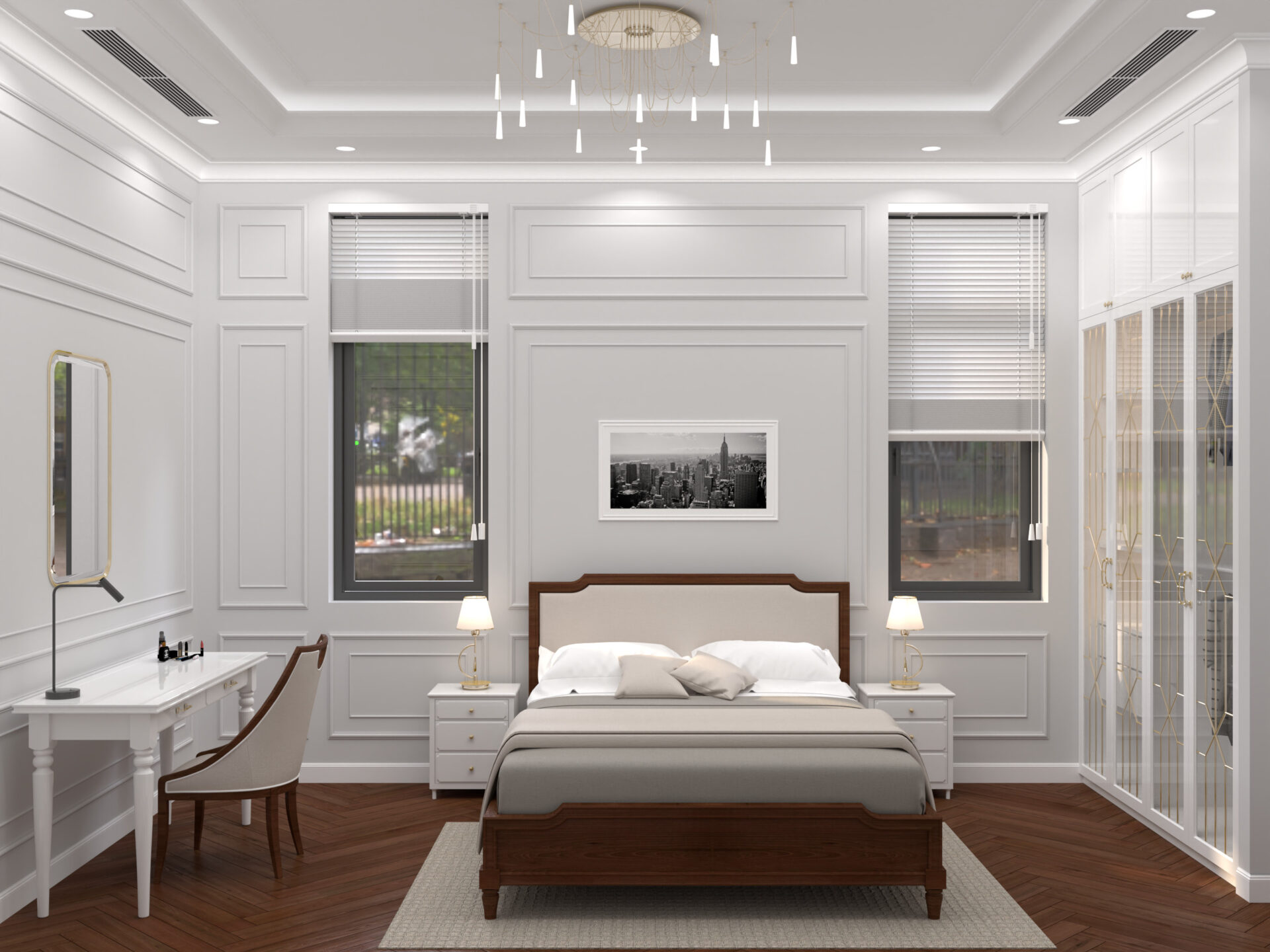 Các kiến trúc sư công ty chúng tôi đã tinh tế chọn gam màu  trắng làm chủ đạo cho phòng ngủ, hài hòa và đảm bảo phòng có nhiều ánh sáng. Gia chủ có thể sử dụng thêm rèm cửa để tùy chỉnh và tận dụng ánh sáng tự nhiên vào ban ngày tốt nhất. Nội thất sử dụng cho phòng ngủ biệt thự cũng cần hài hòa với phong cách tổng thể, cân bằng theo sở thích, cá tính của chủ nhân. Như vậy sẽ mang đến không gian kiến trúc thống nhất mà vẫn cá tính nổi bật của chủ căn phòng.