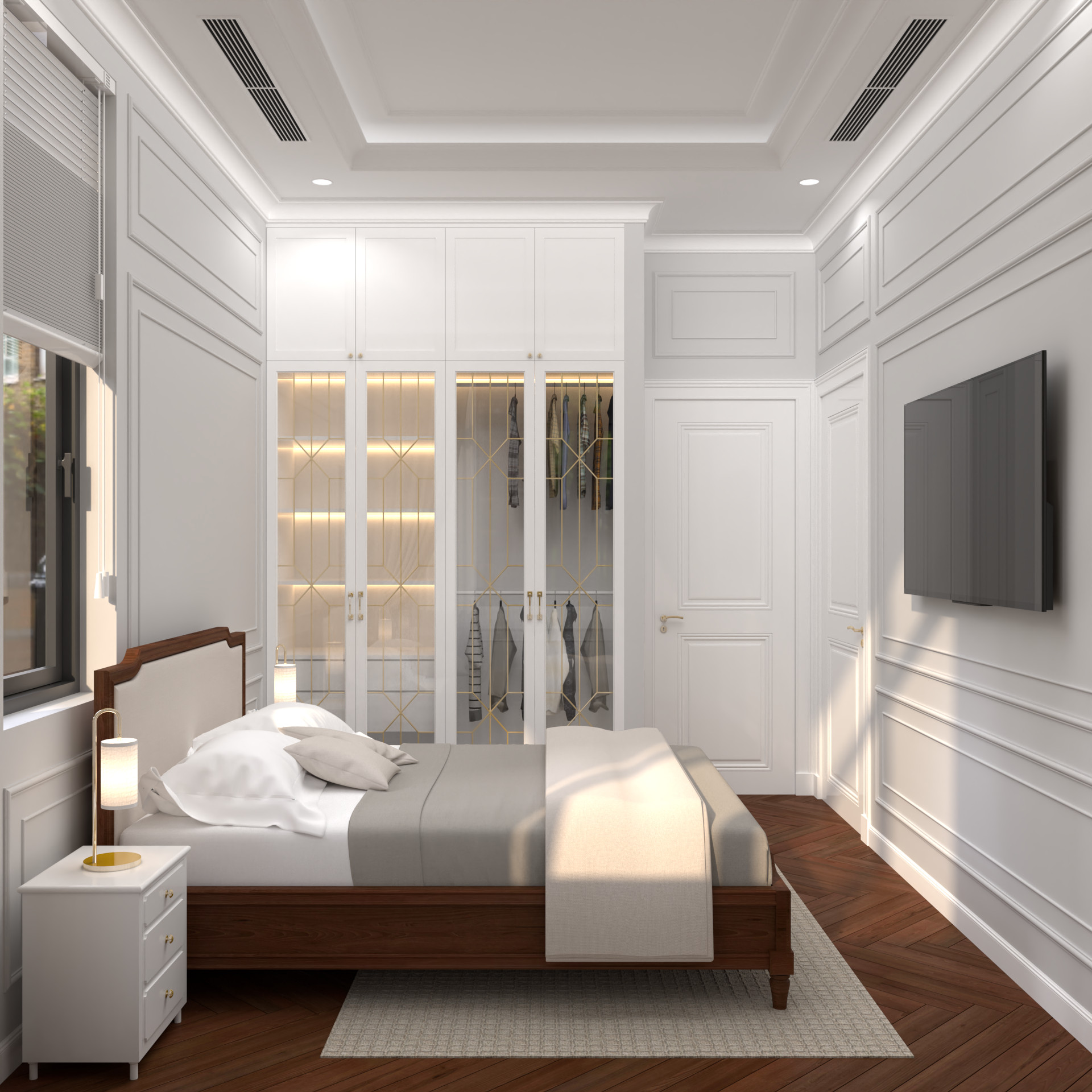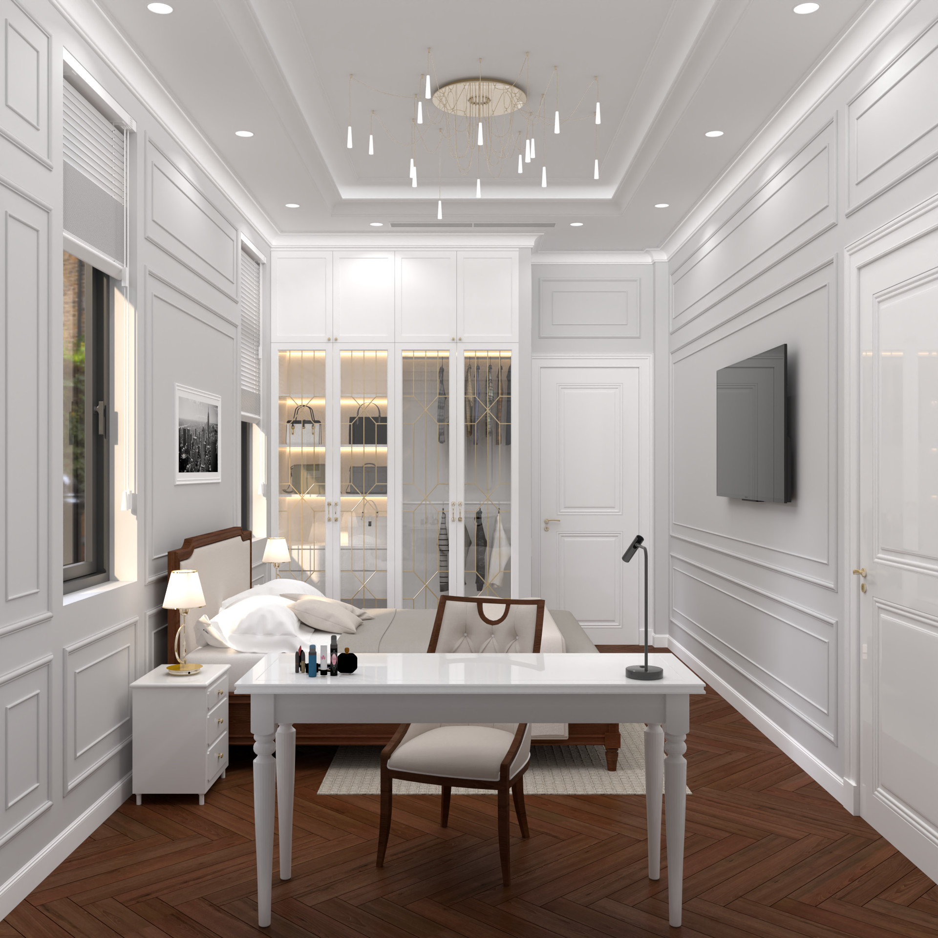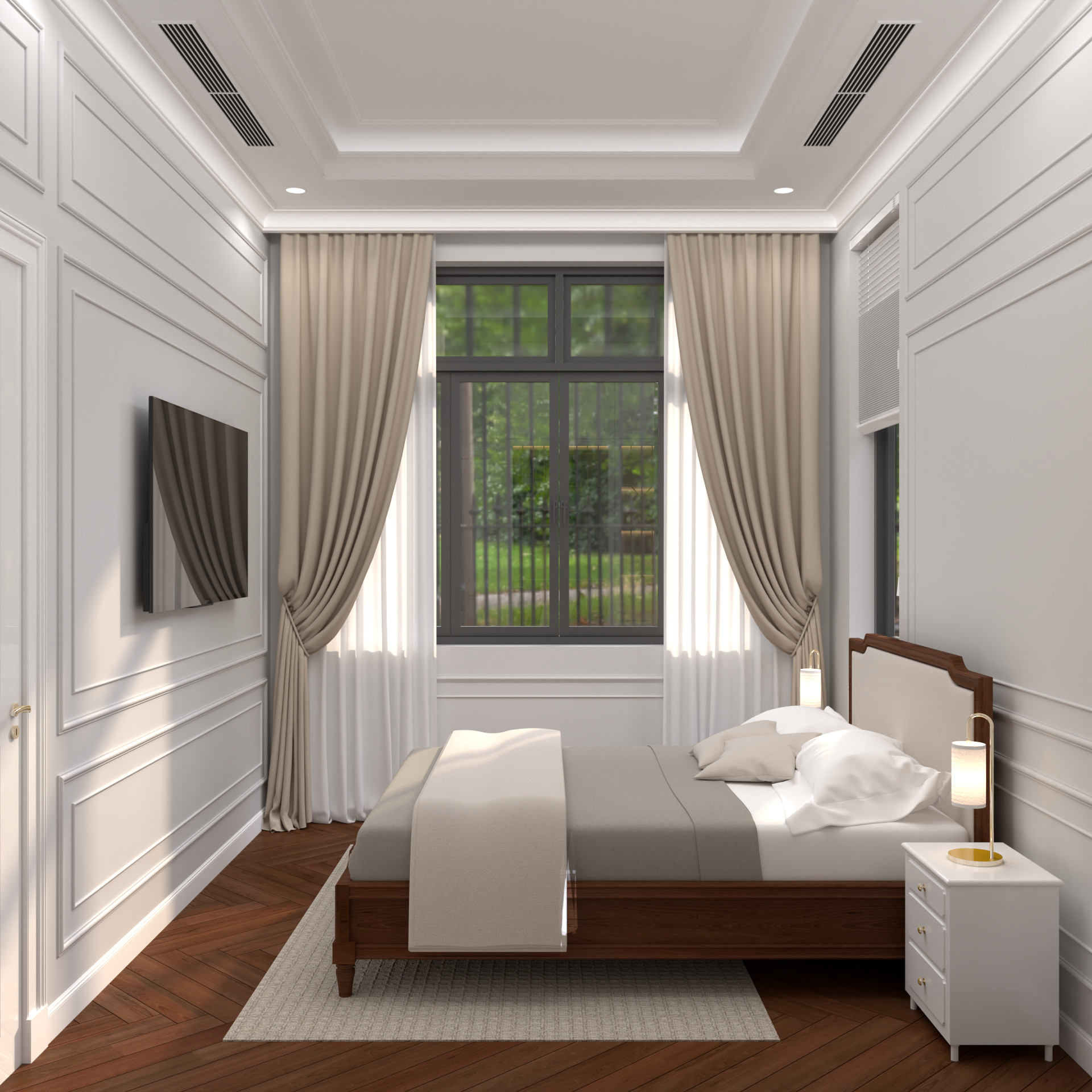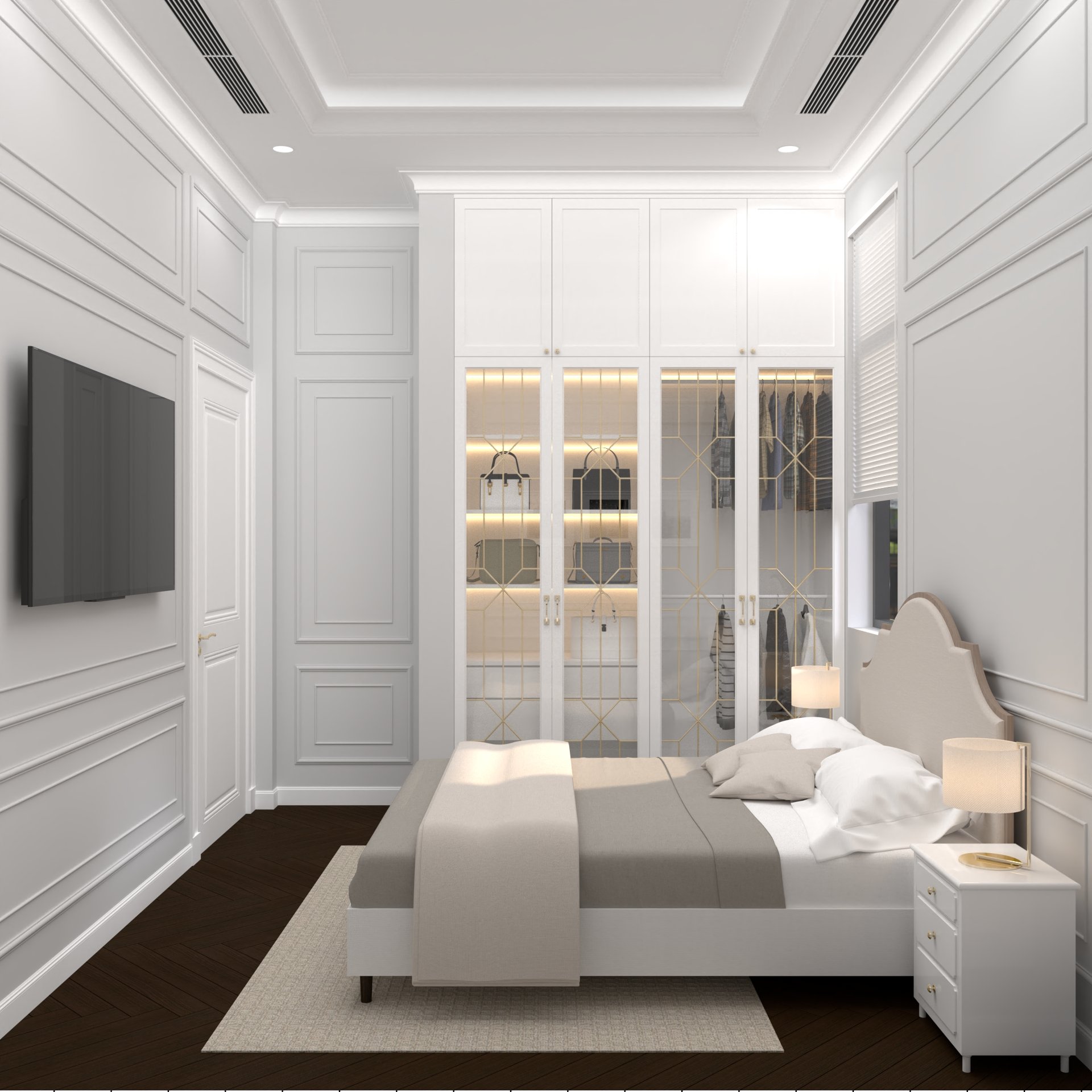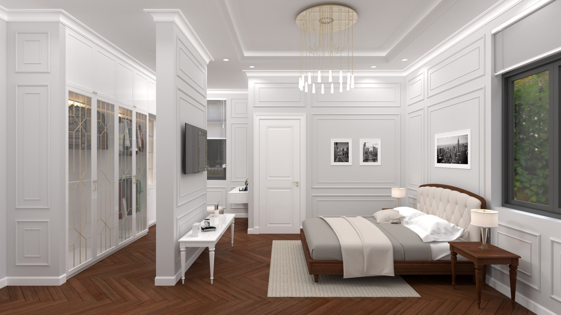Các kiến trúc sư công ty chúng tôi đã tinh tế chọn gam màu  trắng làm chủ đạo cho phòng ngủ, hài hòa và đảm bảo phòng có nhiều ánh sáng. Gia chủ có thể sử dụng thêm rèm cửa để tùy chỉnh và tận dụng ánh sáng tự nhiên vào ban ngày tốt nhất. Nội thất sử dụng cho phòng ngủ biệt thự cũng cần hài hòa với phong cách tổng thể, cân bằng theo sở thích, cá tính của chủ nhân. Như vậy sẽ mang đến không gian kiến trúc thống nhất mà vẫn cá tính nổi bật của chủ căn phòng.