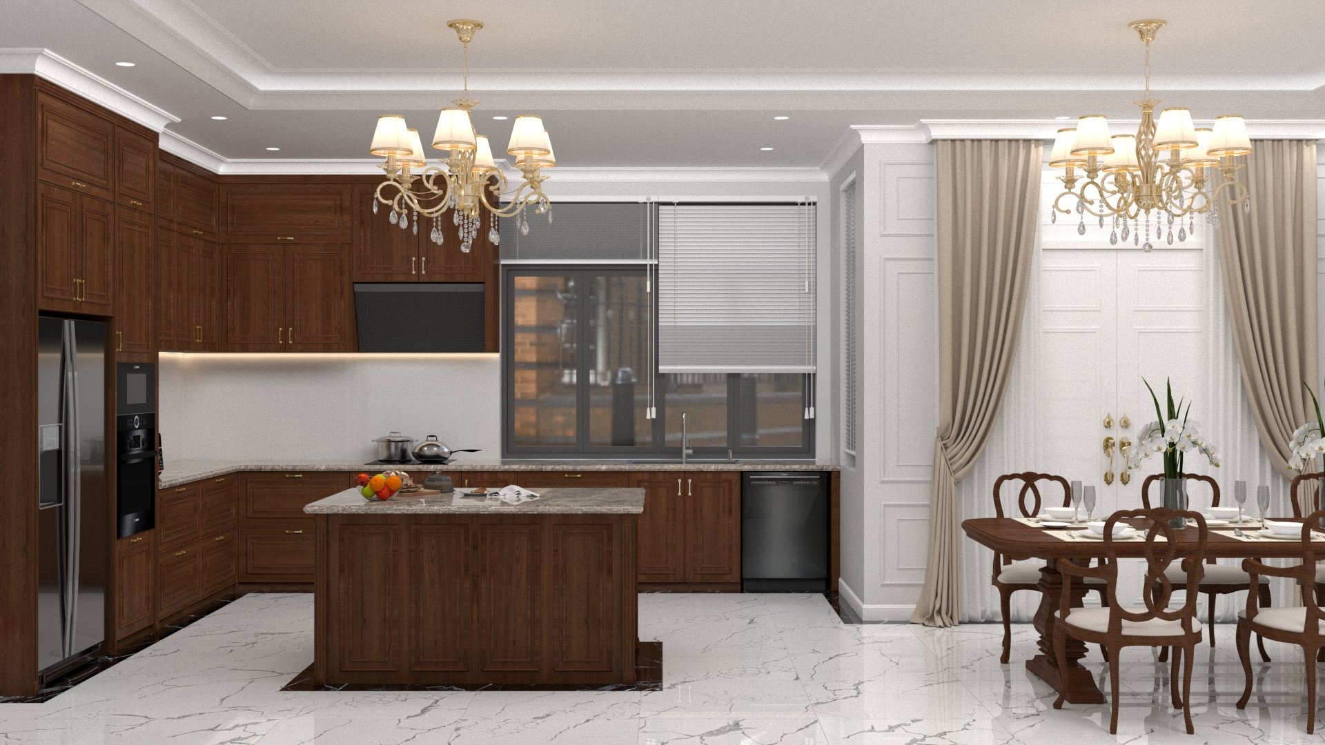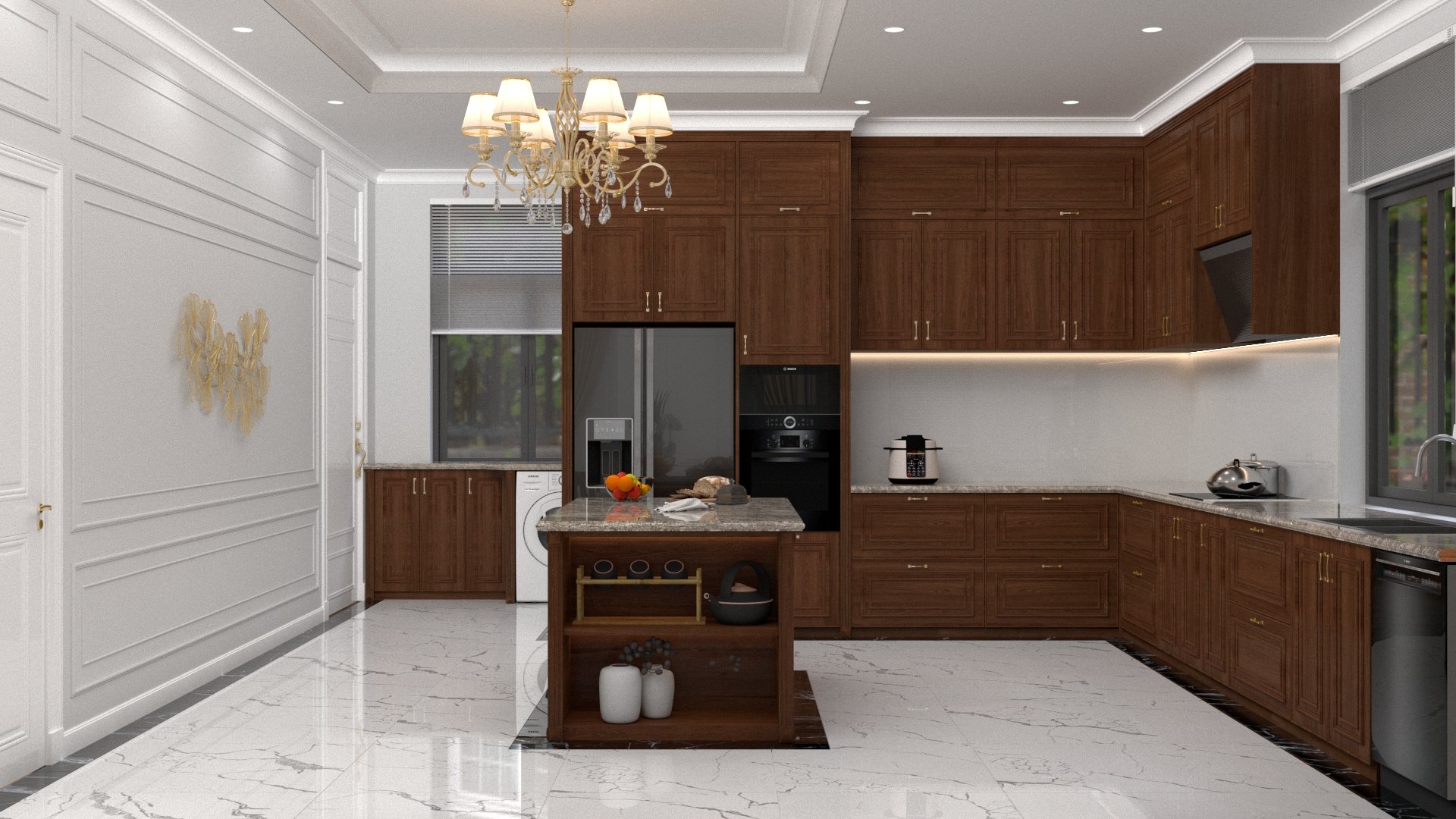 Thiết kế nội thật biệt thự của công ty Thảo Nguyên các kiến trúc sư tinh tế sử dụng hết công năng từng chi tiết  như tủ bếp, bàn ăn, ghế được làm bằng chất liệu gỗ óc chó cao cấp, có khả năng chịu được nhiệt độ cao, tôn lên vẻ sang trọng, ấn tượng ngôi biệt thự của gia chủ, phù hợp với thói quen sinh hoạt, nhu cầu của các thành viên, tối giản vật dụng nội thất của phòng bếp.