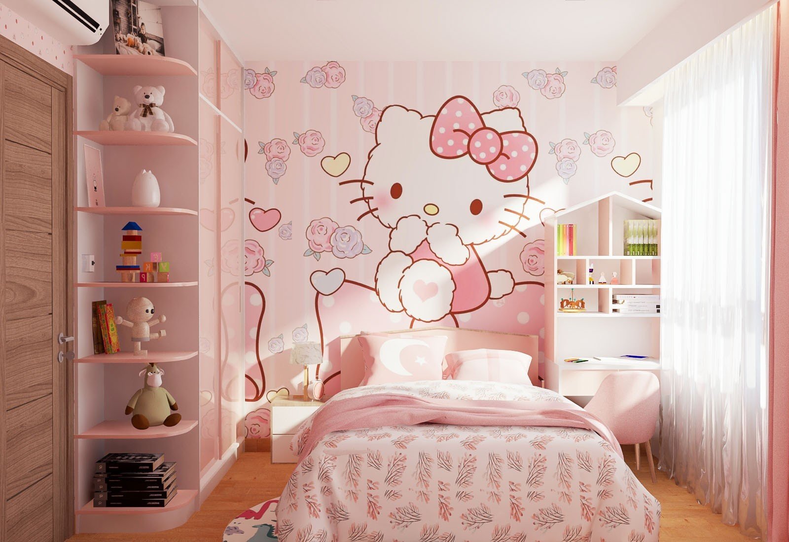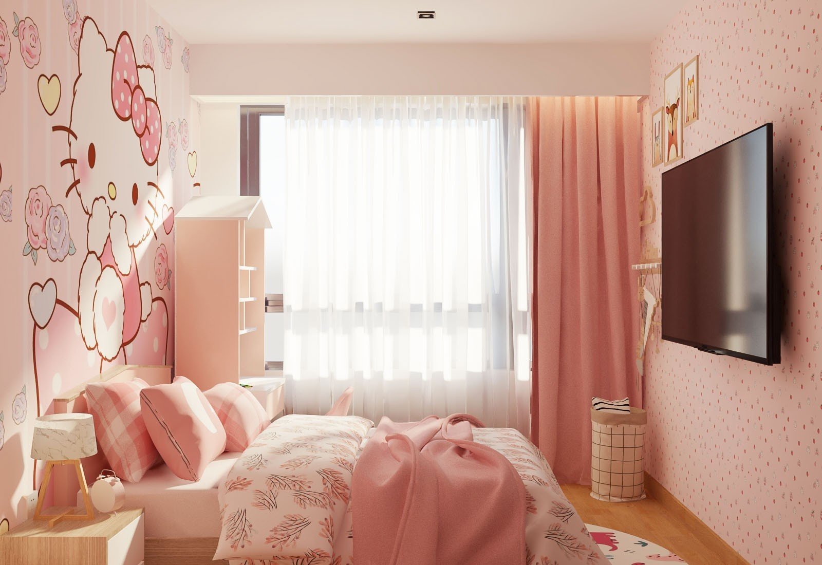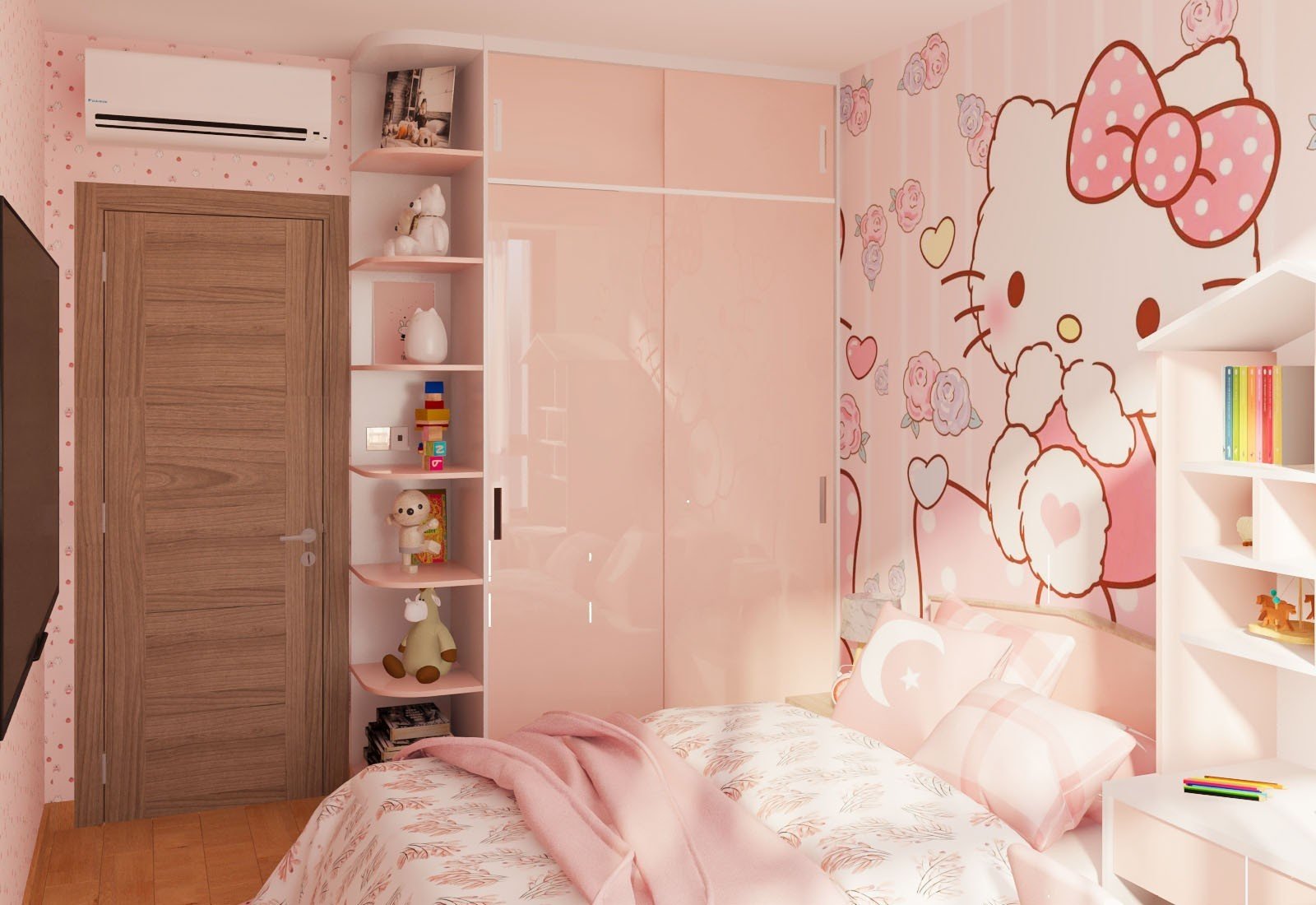 Với thiết kế nội thất phòng ngủ cho bé gái con Chị Hoa được các kiến trúc sư lựa chọn gam màu hồng làm chủ đạo, bố trí bàn học, tủ kệ ốp tường tiết kiệm diện tích căn phòng, cánh cửa sổ được đặt nơi hướng ra ngoài đón ánh sáng trực tiếp vào trong căn phòng mang đến cảm giác thoáng mát và dễ chịu nhất, bàn học tập được bố trí cạnh giường ngủ với giá sách đáng yêu tạo nên không gian ấm ấp thoải mái khi bé tập trung vào việc học.