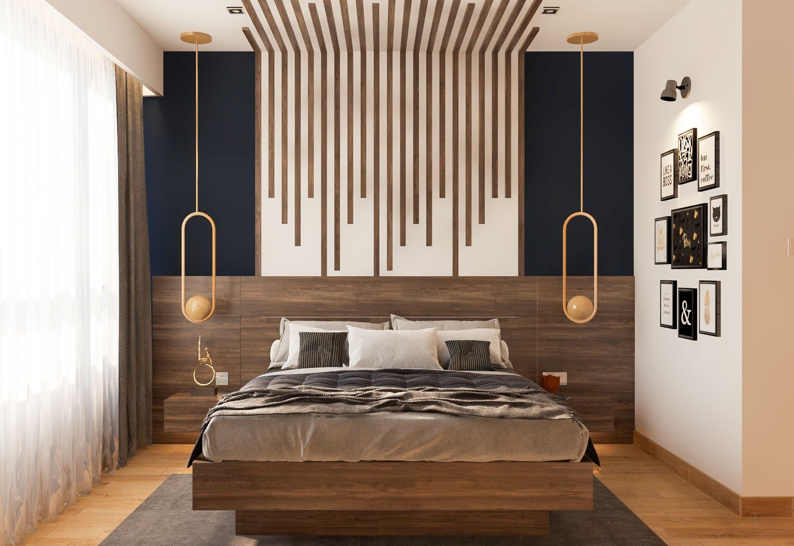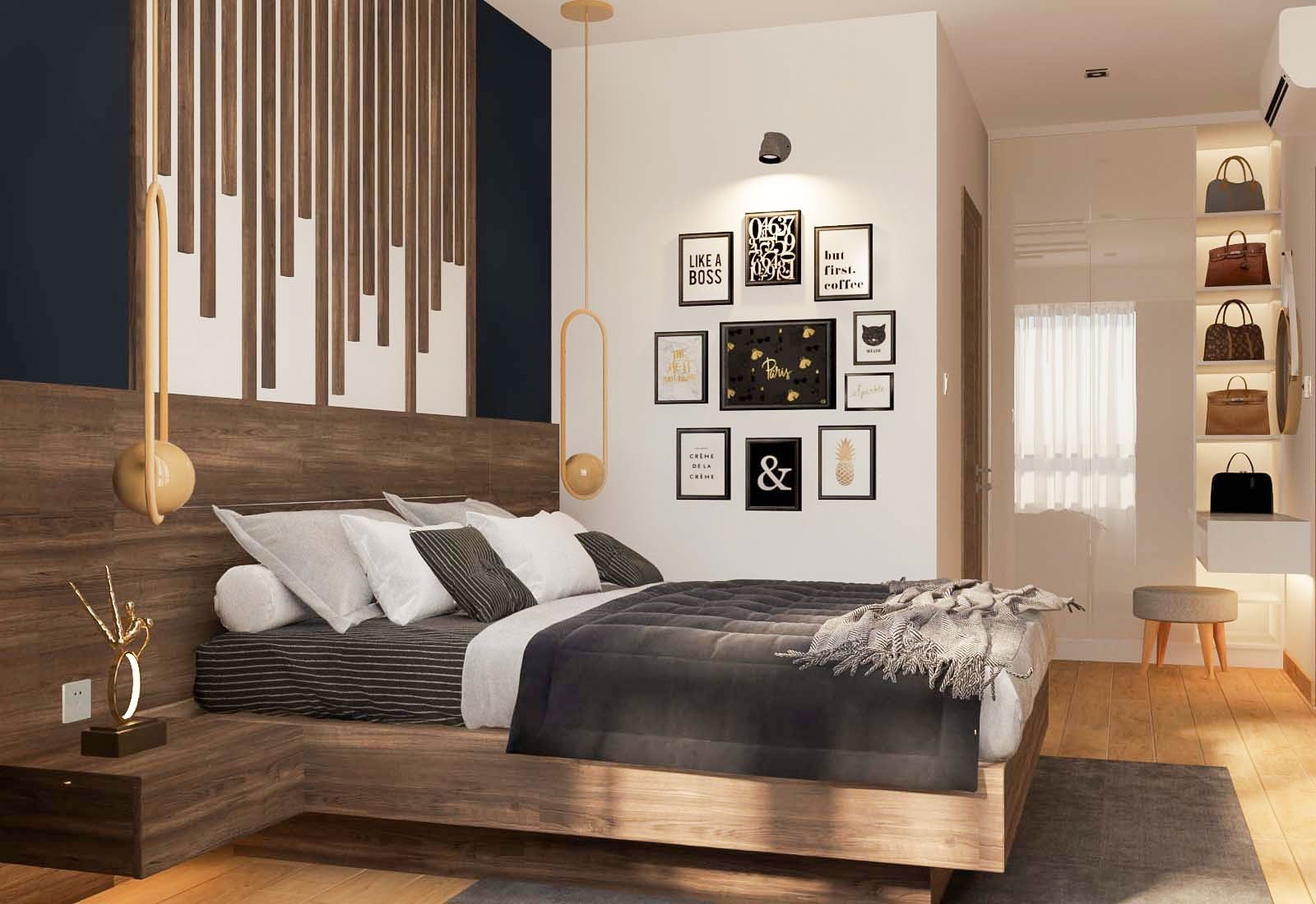 Thiết kế nội thất phòng ngủ được các kiến trúc sư sử dụng màu trắng phối màu nâu gỗ vân cao cấp tạo nên không gian sang trọng. Bàn trang điểm được thiết kế tinh tế, tấm kính trong làm nổi bật phản chiếc ánh đèn ấm áp càng tăng thêm sự sang trọng. Giường ngủ bằng chất liệu gỗ cao cấp, tường được trang trí màu trắng và các thanh gỗ tinh tế. Hưởng lợi từ ánh sáng qua lớp rèm, không gian trở nên rộng rãi, dễ chịu sau ngày làm mệt mỏi.