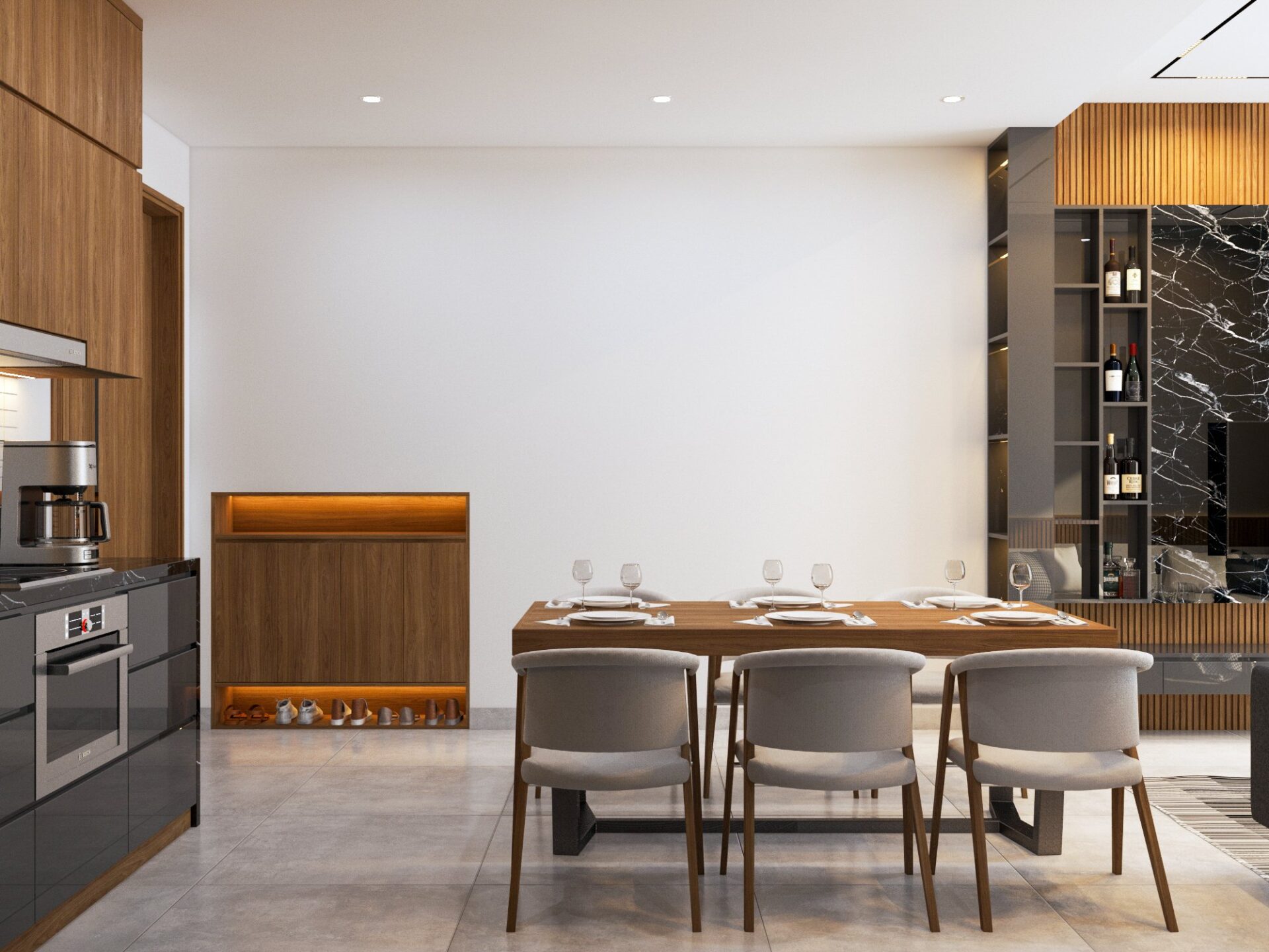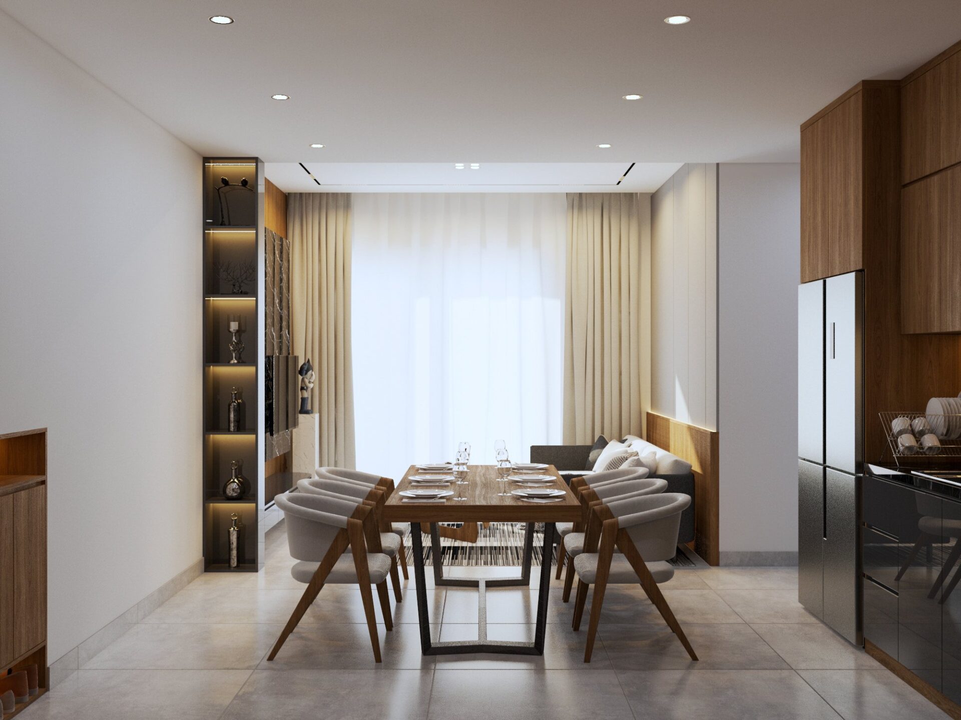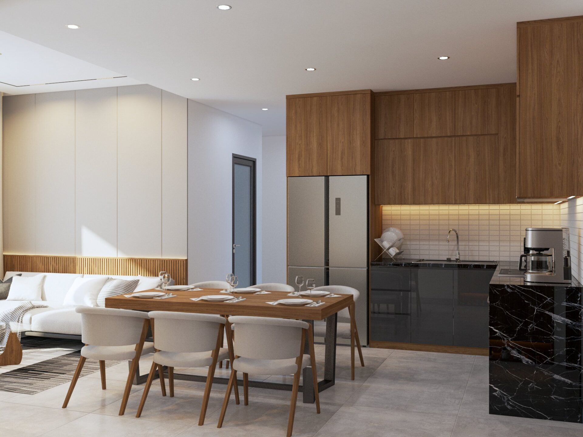 Để tối ưu không gian phòng khách, cũng như nhiều chung cư khác, các kiến trúc sư công ty TNHH thiết kế xây dựng Thảo Nguyên lựa chọn thiết kế phòng khách liền bếp nhằm tiết kiệm thời gian tối đa. Bàn ăn được thiết kế cho 4 người sử dụng loại dành cho 4 người là tối thiểu, giúp giảm thiểu tối đa diện tích chiếm mặt bằng của vật dụng. Tô điểm thêm những chậu hoa mini, cây cảnh và bình bông giúp cân chỉnh không gian trở nên gần gũi với thiên nhiên.