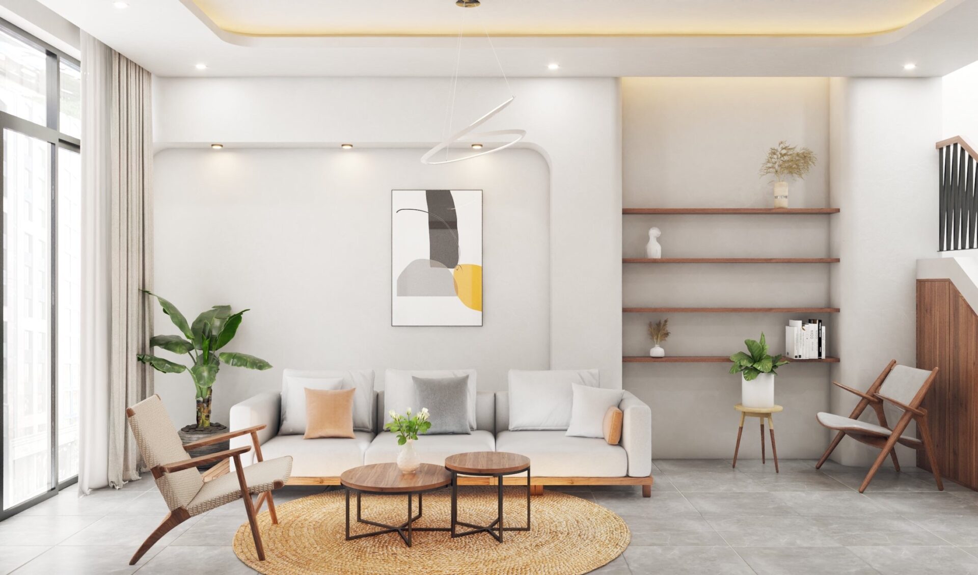 Để tạo phòng khách rộng thoải mái các kiến trúc sư công ty chúng tôi đã khéo léo  phối các đồ nội thất kích thước lớn , thêm vào vài chậu cây xanh để tạo cảm giác gần gũi thiên nhiên cho căn phòng, có thể kê thêm giá sách, bàn trang trí, ghế đơn để thư giãn ngay tại phòng khách. Không gian nội thất phòng khách nhà phố được thiết kế đơn giản, tinh tế, với bộ sofa vải hiện đại màu kem kết hợp cùng chiếc bàn trà gỗ óc chó màu nâu socola tạo nên khối thống nhất mang tính nghệ thuật cao.